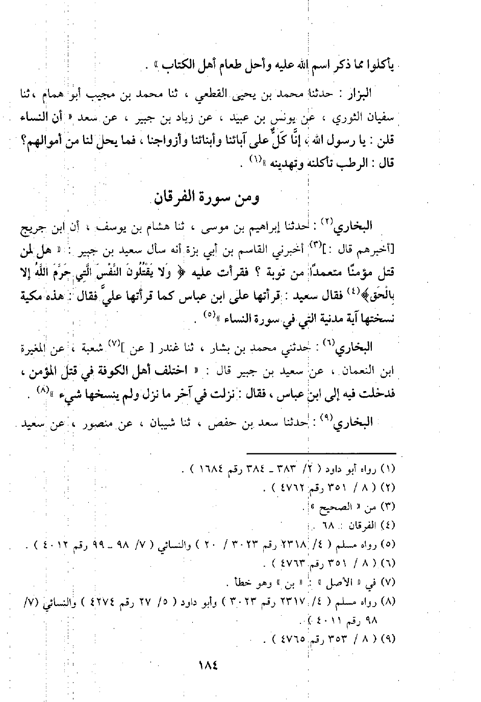 البُخَارِيّ: حَدثنَا إِبْرَاهِيم بن مُوسَى، ثَنَا هِشَام بن يُوسُف، أَن ابْن جريج [أخْبرهُم قَالَ:] أَخْبرنِي الْقَاسِم بن أبي بزَّة أَنه سَأَلَ سعيد بن جُبَير: " هَل لمن قتل مُؤمنا مُتَعَمدا من تَوْبَة؟ فَقَرَأت عَلَيْهِ {وَلَا يقتلُون النَّفس الَّتِي حرم الله إِلَّا بِالْحَقِّ} فَقَالَ سعيد: قرأتها على ابْن عَبَّاس كَمَا قرأتها عَليّ فَقَالَ: هَذِه مَكِّيَّة نسختها آيَة مَدَنِيَّة الَّتِي فِي سُورَة النِّسَاء ".