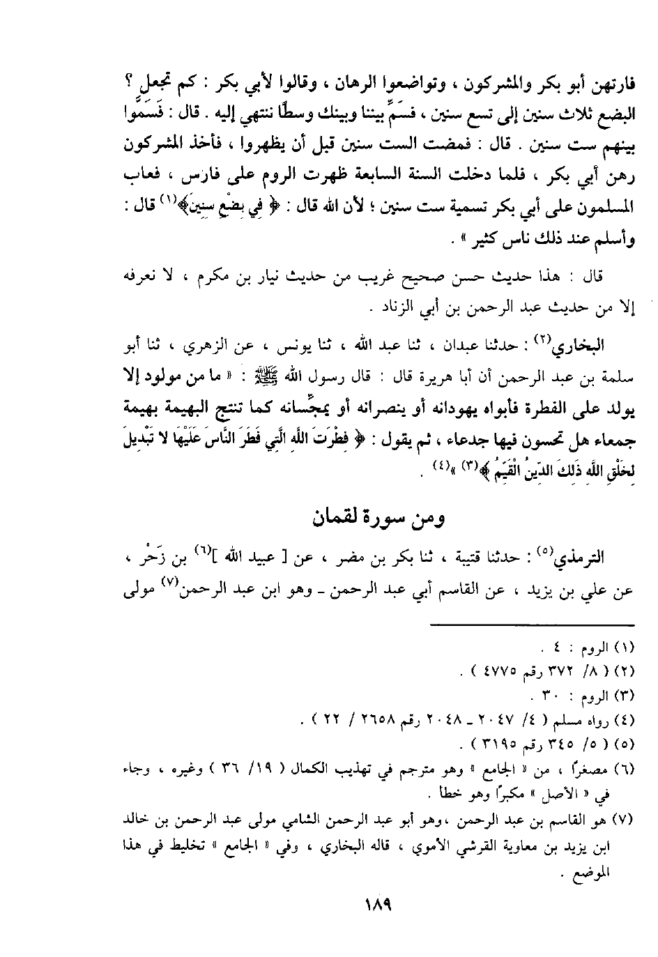 البُخَارِيّ: حَدثنَا عَبْدَانِ، ثَنَا عبد الله، ثَنَا يُونُس، عَن الزُّهْرِيّ، ثَنَا أَبُو سَلمَة بن عبد الرَّحْمَن أَن أَبَا هُرَيْرَة قَالَ: قَالَ رَسُول الله - صَلَّى اللَّهُ عَلَيْهِ وَسَلَّم َ -: " مَا من مَوْلُود إِلَّا يُولد على الْفطْرَة فَأَبَوَاهُ يُهَوِّدَانِهِ أَو ينصرَانِهِ أَو يُمَجِّسَانِهِ كَمَا نتنج الْبَهِيمَة بَهِيمَة جَمْعَاء هَل تُحِسُّونَ فِيهَا جَدْعَاء، ثمَّ يَقُول: {فطرت الله الَّتِي فطر النَّاس عَلَيْهَا لَا تَبْدِيل لخلق الله ذَلِك الدَّين الْقيم} ".