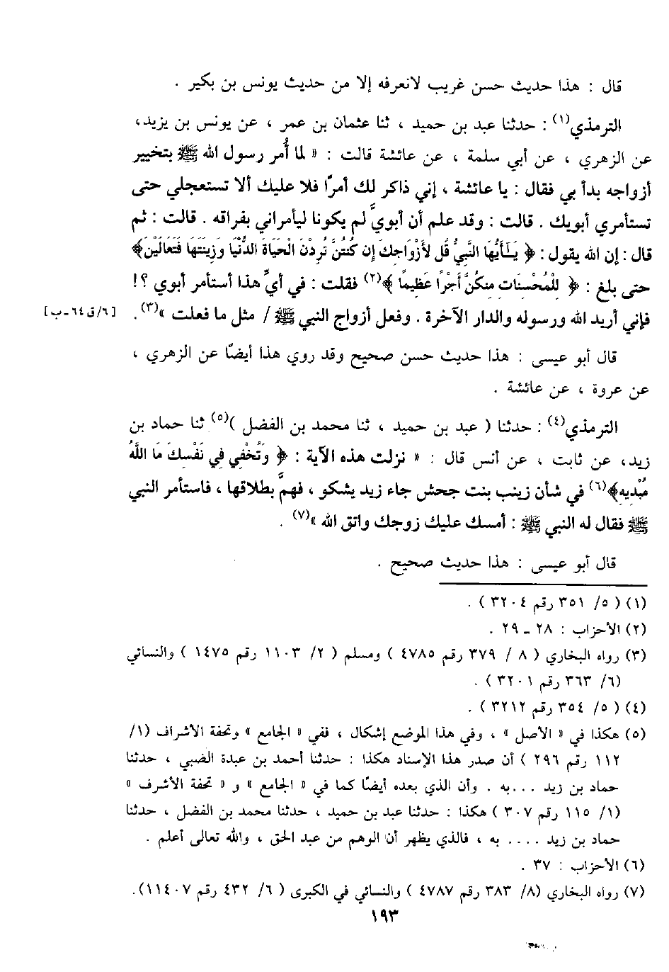 التِّرْمِذِيّ: حَدثنَا عبد بن حميد، ثَنَا عُثْمَان بن عمر، عَن يُونُس بن يزِيد، عَن الزُّهْرِيّ، عَن أبي سَلمَة، عَن عَائِشَة قَالَت: " لما أَمر رَسُول الله - صَلَّى اللَّهُ عَلَيْهِ وَسَلَّم َ - بِتَخْيِير أَزوَاجه بَدَأَ بِي فَقَالَ: يَا عَائِشَة، إِنِّي ذَاكر لَك أمرا فَلَا عَلَيْك أَلا تستعجلي حَتَّى تَسْتَأْمِرِي أَبَوَيْك. قَالَت: وَقد علم أَن أَبَوي لم يَكُونَا ليأمراني بِفِرَاقِهِ. قَالَت: ثمَّ قَالَ: إِن الله يَقُول: {يَا أَيهَا النَّبِي قل لِأَزْوَاجِك إِن كنتن تردن الْحَيَاة الدُّنْيَا وَزينتهَا فتعالين} حَتَّى بلغ: {للمحسنات مِنْكُن أجرا عَظِيما} فَقلت: فِي أَي هَذَا أَستَأْمر أَبَوي؟ ! فَإِنِّي أُرِيد الله وَرَسُوله وَالدَّار الْآخِرَة. وَفعل أَزوَاج النَّبِي - صَلَّى اللَّهُ عَلَيْهِ وَسَلَّم َ - / مثل مَا فعلت ".