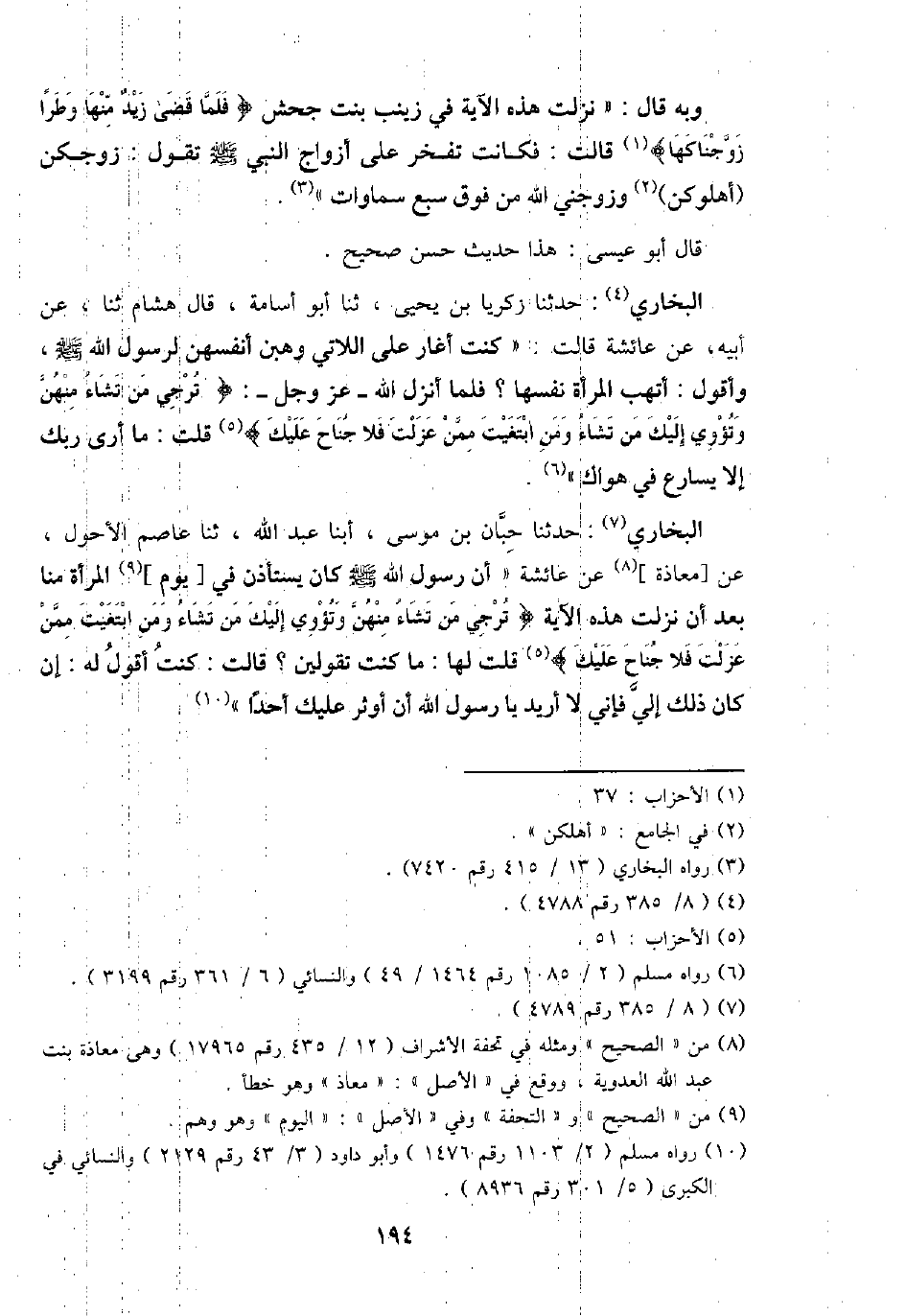 البُخَارِيّ: حَدثنَا حبَان بن مُوسَى، أبنا عبد الله، ثَنَا عَاصِم الْأَحول، عَن [معَاذَة] عَن عَائِشَة " أَن رَسُول الله - صَلَّى اللَّهُ عَلَيْهِ وَسَلَّم َ - كَانَ يسْتَأْذن فِي [يَوْم] الْمَرْأَة منا بعد أَن نزلت هَذِه الْآيَة {ترجي من تشَاء مِنْهُنَّ وَتُؤْوِي إِلَيْك من تشَاء وَمن ابْتَغَيْت مِمَّن عزلت فَلَا جنَاح عَلَيْك} قلت لَهَا: مَا كنت تَقُولِينَ؟ قَالَت: كنت أَقُول لَهُ: إِن كَانَ ذَلِك إِلَيّ فَإِنِّي لَا أُرِيد يَا رَسُول الله أَن أوثر عَلَيْك أحدا ".
