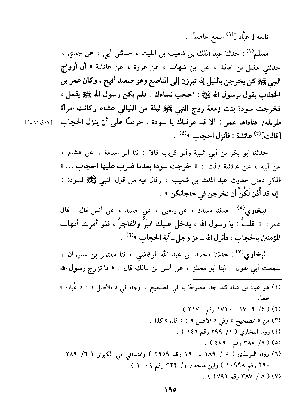 مُسلم: حَدثنَا عبد الْملك بن شُعَيْب بن اللَّيْث، حَدثنِي أبي، عَن جدي، حَدثنِي عقيل بن خَالِد، عَن ابْن شهَاب، عَن عُرْوَة، عَن عَائِشَة " أَن أَزوَاج النَّبِي - صَلَّى اللَّهُ عَلَيْهِ وَسَلَّم َ - كن يخْرجن بِاللَّيْلِ إِذا تبرزن إِلَى المناصع وَهُوَ صَعِيد أفيح، وَكَانَ عمر بن الْخطاب يَقُول لرَسُول الله - صَلَّى اللَّهُ عَلَيْهِ وَسَلَّم َ -: احجب نِسَاءَك. فَلم يكن رَسُول الله - صَلَّى اللَّهُ عَلَيْهِ وَسَلَّم َ - يفعل، فَخرجت سَوْدَة بنت زَمعَة زوج النَّبِي - صَلَّى اللَّهُ عَلَيْهِ وَسَلَّم َ - لَيْلَة من اللَّيَالِي عشَاء وَكَانَت امْرَأَة طَوِيلَة / فناداها عمر: أَلا قد عرفناك يَا سَوْدَة. حرصا على أَن ينزل الْحجاب [قَالَت] عَائِشَة: فَأنْزل الْحجاب ".