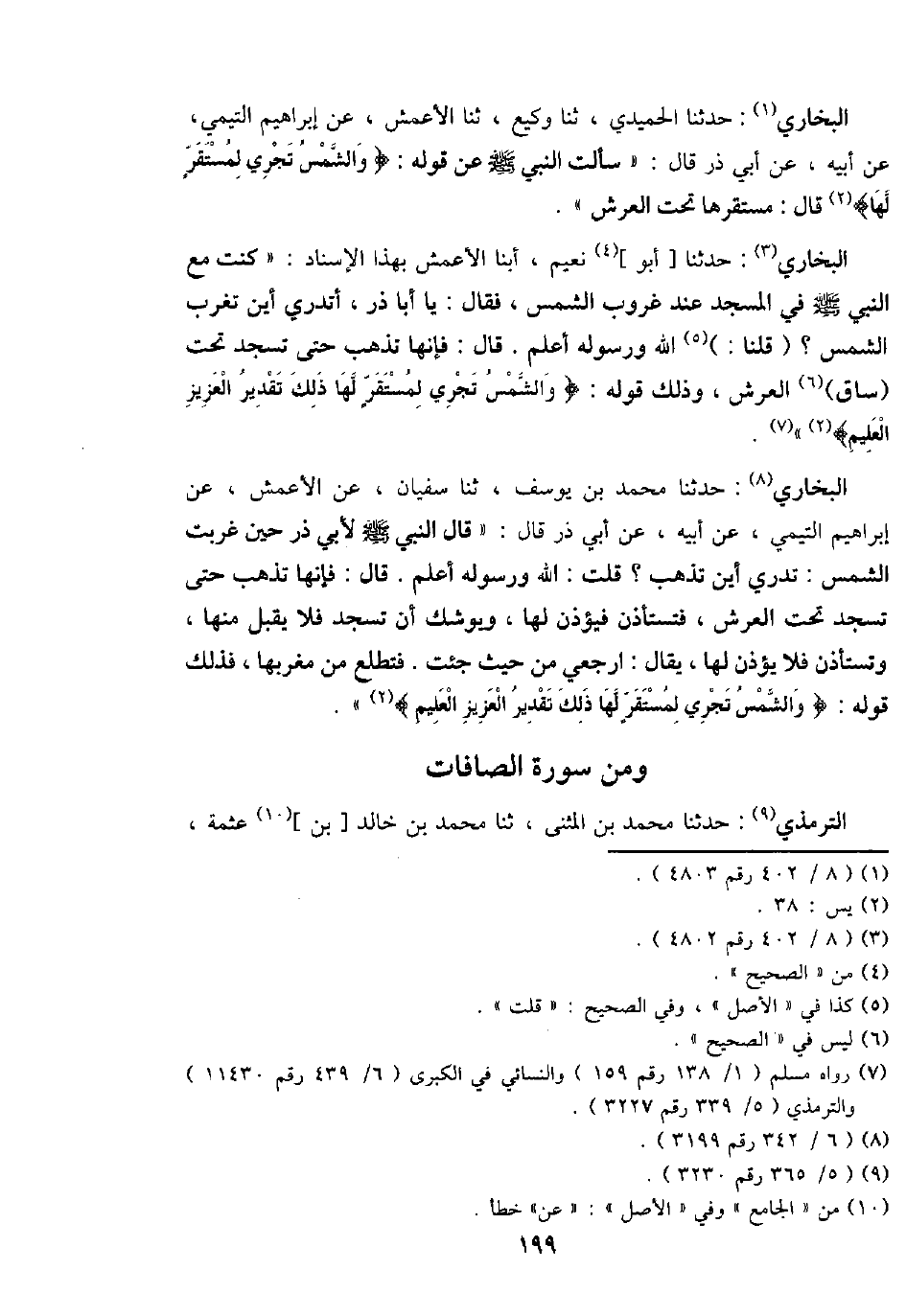 البُخَارِيّ: حَدثنَا الْحميدِي، ثَنَا وَكِيع، ثَنَا الْأَعْمَش، عَن إِبْرَاهِيم التَّيْمِيّ، عَن أَبِيه، عَن أبي ذَر قَالَ: " سَأَلت النَّبِي - صَلَّى اللَّهُ عَلَيْهِ وَسَلَّم َ - عَن قَوْله: {وَالشَّمْس تجْرِي لمستقر لَهَا} قَالَ: مستقرها تَحت الْعَرْش ".