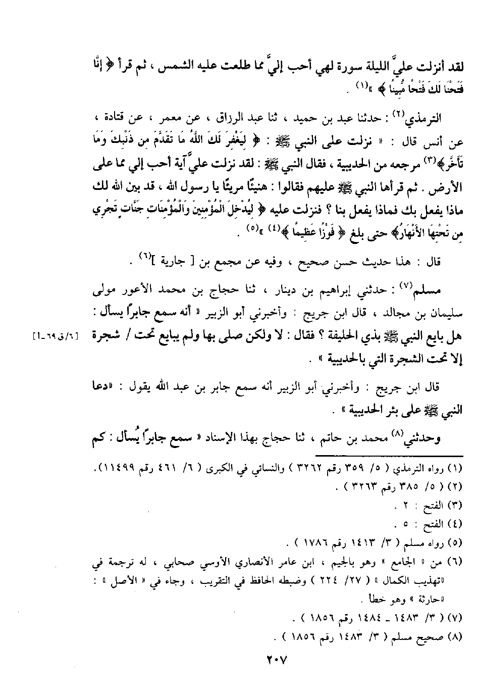 التِّرْمِذِيّ: حَدثنَا عبد بن حميد، ثَنَا عبد الرَّزَّاق، عَن معمر، عَن قَتَادَة، عَن أنس قَالَ: " نزلت على النَّبِي - صَلَّى اللَّهُ عَلَيْهِ وَسَلَّم َ -: {ليغفر لَك الله مَا تقدم من ذَنْبك وَمَا تَأَخّر} مرجعه من الْحُدَيْبِيَة، فَقَالَ النَّبِي - صَلَّى اللَّهُ عَلَيْهِ وَسَلَّم َ - لقد نزلت عَليّ آيَة أحب إِلَيّ مِمَّا على الأَرْض. ثمَّ قَرَأَهَا النَّبِي - صَلَّى اللَّهُ عَلَيْهِ وَسَلَّم َ - عَلَيْهِم فَقَالُوا: هَنِيئًا مريئا يَا رَسُول الله، قد بَين الله لَك مَاذَا يفعل بك فَمَاذَا يفعل بِنَا؟ فَنزلت عَلَيْهِ {ليدْخل الْمُؤمنِينَ وَالْمُؤْمِنَات جنَّات تجْرِي من تحتهَا الْأَنْهَار} حَتَّى بلغ {فوزا عَظِيما} ".