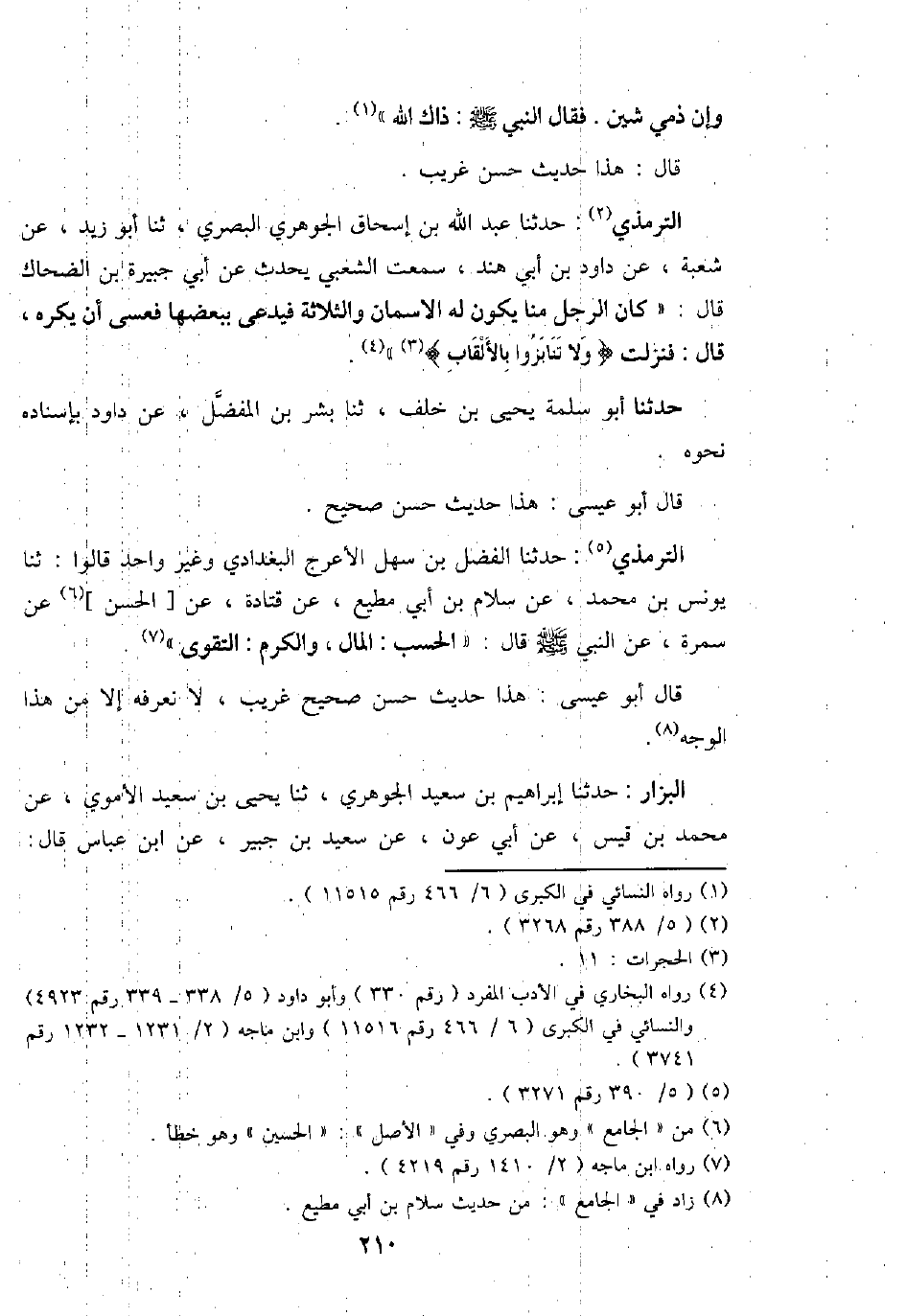التِّرْمِذِيّ: حَدثنَا عبد الله بن إِسْحَاق الْجَوْهَرِي الْبَصْرِيّ، ثَنَا أَبُو زيد، عَن شُعْبَة، عَن دَاوُد بن أبي هِنْد، سَمِعت الشّعبِيّ يحدث عَن أبي جبيرَة بن الضَّحَّاك قَالَ: " كَانَ الرجل منا يكون لَهُ الاسمان وَالثَّلَاثَة فيدعى بِبَعْضِهَا فَعَسَى أَن يكره، قَالَ: فَنزلت {وَلَا تنابزوا بِالْأَلْقَابِ} ".