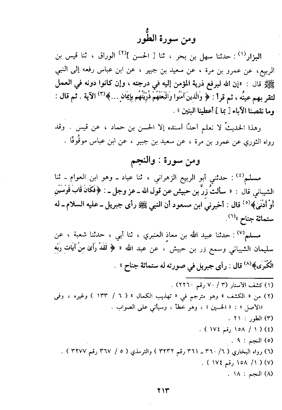 مُسلم: حَدثنِي أَبُو الرّبيع الزهْرَانِي، ثَنَا عباد - وَهُوَ ابْن الْعَوام - ثَنَا الشَّيْبَانِيّ قَالَ: " سَأَلت زر بن حُبَيْش عَن قَول الله - عز وَجل -: {فَكَانَ قاب قوسين أَو أدنى} قَالَ: أَخْبرنِي ابْن مَسْعُود أَن النَّبِي - صَلَّى اللَّهُ عَلَيْهِ وَسَلَّم َ - رأى جِبْرِيل - عَلَيْهِ السَّلَام - لَهُ سِتّمائَة جنَاح ".