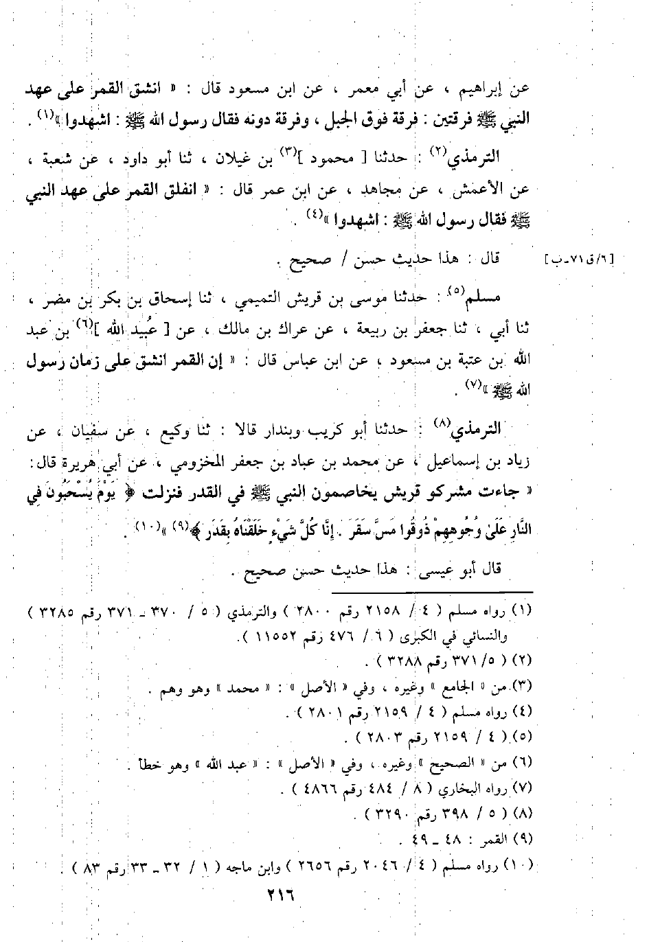 مُسلم: حَدثنَا مُوسَى بن قُرَيْش التَّمِيمِي، ثَنَا إِسْحَاق بن بكر بن مُضر، ثَنَا أبي، ثَنَا جَعْفَر بن ربيعَة، عَن عرَاك بن مَالك، عَن [عبيد الله] بن عبد الله بن عتبَة بن مَسْعُود، عَن ابْن عَبَّاس قَالَ: " إِن الْقَمَر انْشَقَّ على زمَان رَسُول الله - صَلَّى اللَّهُ عَلَيْهِ وَسَلَّم َ - ".