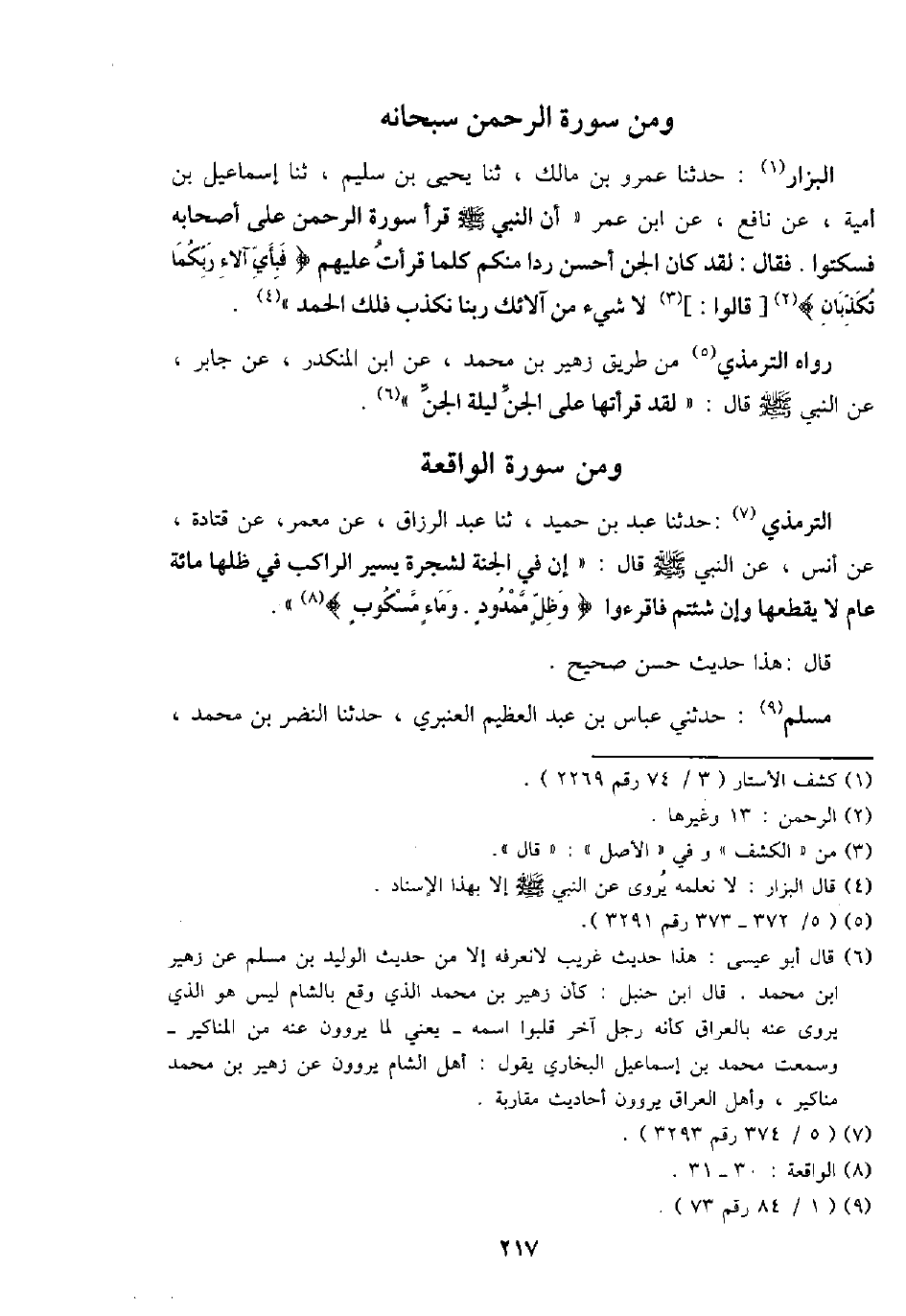 الْبَزَّار: حَدثنَا عَمْرو بن مَالك، ثَنَا يحيى بن سليم، ثَنَا إِسْمَاعِيل بن أُميَّة، عَن نَافِع، عَن ابْن عمر " أَن النَّبِي - صَلَّى اللَّهُ عَلَيْهِ وَسَلَّم َ - قَرَأَ سُورَة الرَّحْمَن على أَصْحَابه فَسَكَتُوا. فَقَالَ: لقد كَانَ الْجِنّ أحسن ردا مِنْكُم كلما قَرَأت عَلَيْهِم {فَبِأَي آلَاء رَبكُمَا تُكَذِّبَانِ} [قَالُوا:] لَا شَيْء من آلَائِكَ رَبنَا نكذب فلك الْحَمد: