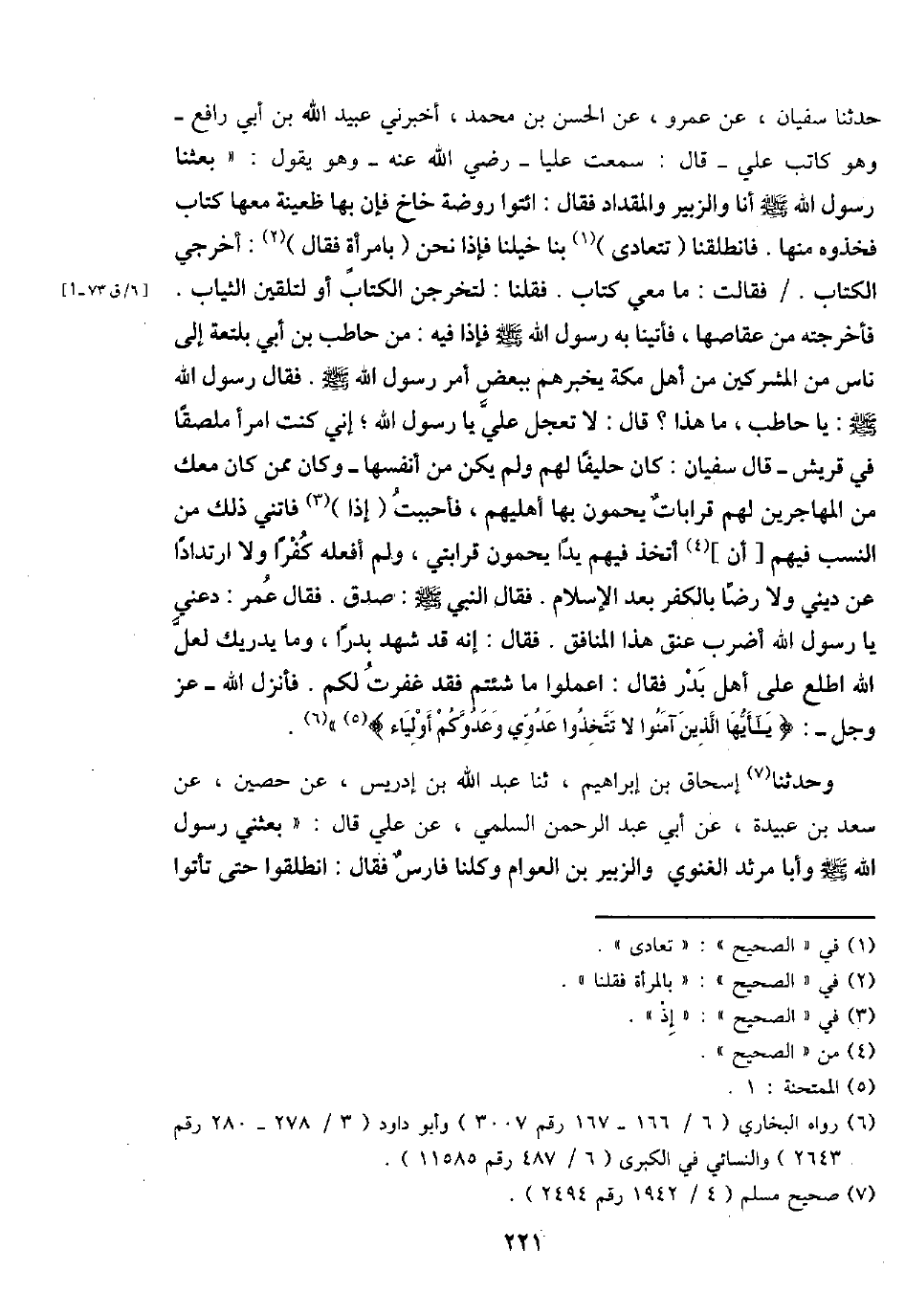 حَدثنَا سُفْيَان، عَن عَمْرو، عَن الْحسن بن مُحَمَّد، أَخْبرنِي عبيد الله بن أبي رَافع - وَهُوَ كَاتب عَليّ - قَالَ: سَمِعت عليا - رَضِي الله عَنهُ - وَهُوَ يَقُول: " بعثنَا رَسُول الله - صَلَّى اللَّهُ عَلَيْهِ وَسَلَّم َ - أَنا وَالزُّبَيْر والمقداد فَقَالَ: ائْتُوا رَوْضَة خَاخ فَإِن بهَا ظَعِينَة مَعهَا كتاب فَخُذُوهُ مِنْهَا. فَانْطَلَقْنَا (تَتَعَادَى) بِنَا خَيْلنَا فَإِذا نَحن (بِامْرَأَة فَقَالَ) : أَخْرِجِي الْكتاب. / فَقَالَت / مَا معي كتاب. فَقُلْنَا: لتخْرجن الْكتاب أَو لتلْقين الثِّيَاب. فَأَخْرَجته من عقاصها، فأتينا بِهِ رَسُول الله - صَلَّى اللَّهُ عَلَيْهِ وَسَلَّم َ - فَإِذا فِيهِ: من حَاطِب بن أبي بلتعة إِلَى نَاس من الْمُشْركين من أهل مَكَّة يُخْبِرهُمْ بِبَعْض أَمر رَسُول الله - صَلَّى اللَّهُ عَلَيْهِ وَسَلَّم َ -. فَقَالَ رَسُول الله - صَلَّى اللَّهُ عَلَيْهِ وَسَلَّم َ -: يَا حَاطِب، مَا هَذَا؟ قَالَ: لَا تعجل عَليّ يَا رَسُول الله؛ إِنِّي كنت امْرأ مُلْصقًا فِي قُرَيْش - قَالَ سُفْيَان: كَانَ حليفا لَهُم وَلم يكن من أَنْفسهَا - وَكَانَ مِمَّن كَانَ مَعَك من الْمُهَاجِرين لَهُم قَرَابَات يحْمُونَ بهَا أَهْليهمْ، فَأَحْبَبْت (إِذا) فَاتَنِي ذَلِك من النّسَب فيهم [أَن] أَتَّخِذ فيهم يدا يحْمُونَ قَرَابَتي، وَلم أَفعلهُ كفرا وَلَا ارْتِدَادًا عَن ديني وَلَا رضَا بالْكفْر بعد الْإِسْلَام. فَقَالَ النَّبِي - صَلَّى اللَّهُ عَلَيْهِ وَسَلَّم َ -: صدق. فَقَالَ عمر: دَعْنِي يَا رَسُول الله أضْرب عنق هَذَا الْمُنَافِق. فَقَالَ: إِنَّه قد شهد بدار، وَمَا يدْريك لَعَلَّ الله اطلع على أهل بدر فَقَالَ: اعْمَلُوا مَا شِئْتُم فقد غفرت لكم. فَأنْزل الله - عز وَجل -: {يَا أَيهَا الَّذين آمنُوا لَا تَتَّخِذُوا عدوي وَعَدُوكُمْ أَوْلِيَاء} ".