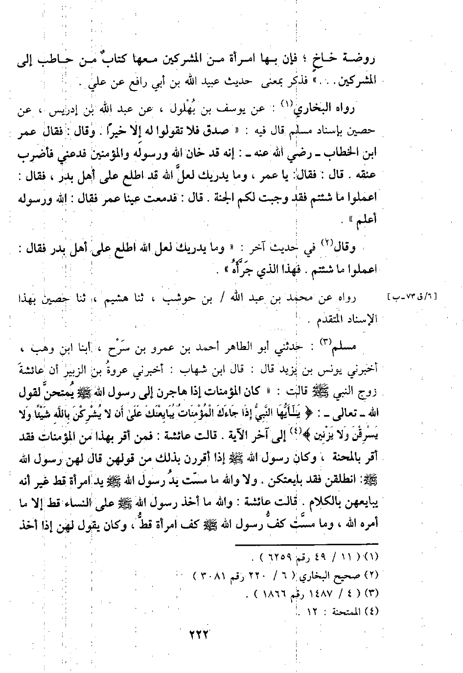 رَوَاهُ البُخَارِيّ: عَن يُوسُف بن بهْلُول، عَن عبد الله بن إِدْرِيس، عَن حُصَيْن بِإِسْنَاد مُسلم قَالَ فِيهِ: " صدق فَلَا تَقولُوا لَهُ إِلَّا خيرا. وَقَالَ: فَقَالَ عمر ابْن الْخطاب - رَضِي الله عَنهُ -: إِنَّه قد خَان الله وَرَسُوله وَالْمُؤمنِينَ فَدَعْنِي فَأَضْرب عُنُقه. قَالَ: فَقَالَ: يَا عمر، وَمَا يدْريك لَعَلَّ الله قد اطلع على أهل بدر، فَقَالَ: اعْمَلُوا مَا شِئْتُم فقد وَجَبت لكم الْجنَّة. قَالَ: فَدَمَعَتْ عينا عمر فَقَالَ: الله وَرَسُوله أعلم ".
