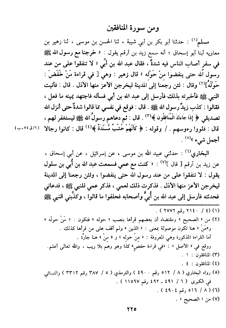 مُسلم: حَدثنَا أَبُو بكر بن أبي شيبَة، ثَنَا الْحسن بن مُوسَى، ثَنَا زُهَيْر بن مُعَاوِيَة أبنا أَبُو إِسْحَاق؛ أَنه سمع زيد بن أَرقم يَقُول: " خرجنَا مَعَ رَسُول الله - صَلَّى اللَّهُ عَلَيْهِ وَسَلَّم َ - فِي سفر أصَاب النَّاس فِيهِ شدَّة، فَقَالَ عبد الله بن أبي " لَا تنفقوا على من عِنْد رَسُول الله حَتَّى يَنْفضوا من حوله " قَالَ زُهَيْر: وَهِي [فِي قِرَاءَة من خفض: حوله] وَقَالَ: لَئِن رَجعْنَا إِلَى الْمَدِينَة ليخرجن الْأَعَز مِنْهَا الْأَذَل. قَالَ: فَأتيت النَّبِي - صَلَّى اللَّهُ عَلَيْهِ وَسَلَّم َ - فَأَخْبَرته بذلك فَأرْسل إِلَى عبد الله بن أبي فَسَأَلَهُ فاجتهد يَمِينه مَا فعل، فَقَالُوا: كذب زيد رَسُول الله - صَلَّى اللَّهُ عَلَيْهِ وَسَلَّم َ -. قَالَ: فَوَقع فِي نَفسِي مَا قَالُوا شدَّة حَتَّى أنزل الله تصديقي {إِذا جَاءَك المُنَافِقُونَ} . قَالَ: ثمَّ دعاهم رَسُول الله - صَلَّى اللَّهُ عَلَيْهِ وَسَلَّم َ - ليَسْتَغْفِر لَهُم، قَالَ: فلووا رُءُوسهم. / وَقَوله: {كَأَنَّهُمْ خشب مُسندَة} قَالَ: كَانُوا رجَالًا أجمل شَيْء ".