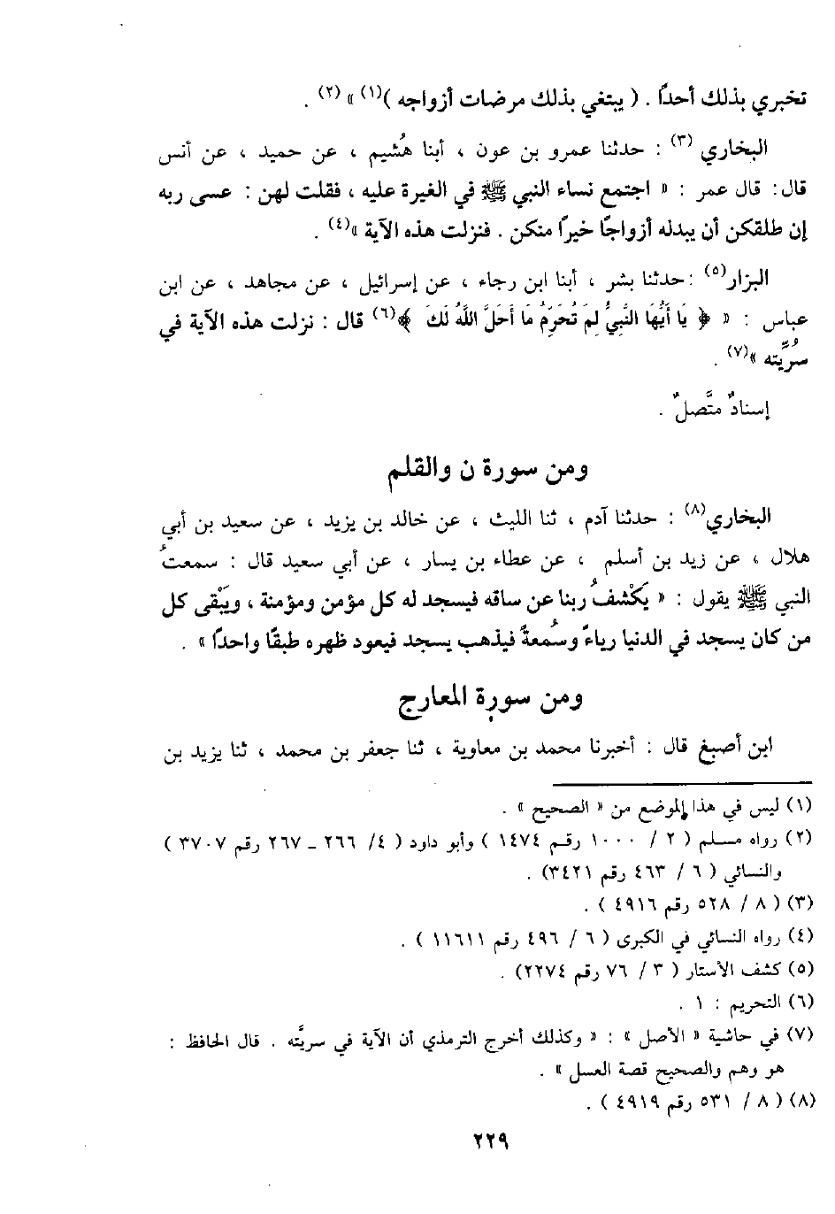 البُخَارِيّ: حَدثنَا عَمْرو بن عون، أبنا هثيم، عَن حميد، عَن أنس قَالَ: قَالَ عمر: " اجْتمع نسَاء النَّبِي - صَلَّى اللَّهُ عَلَيْهِ وَسَلَّم َ - فِي الْغيرَة عَلَيْهِ، فَقلت لَهُنَّ: عَسى ربه إِن طَلَّقَكُن أَن يُبدلهُ أَزْوَاجًا خيرا مِنْكُن. فَنزلت هَذِه الْآيَة ".