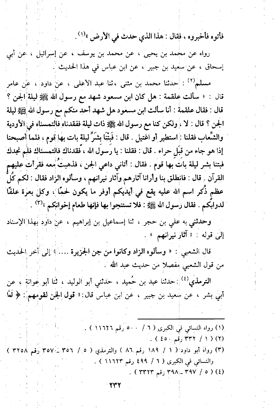 مُسلم: حَدثنَا مُحَمَّد بن مثنى، ثَنَا عبد الْأَعْلَى، عَن دَاوُد، عَن عَامر قَالَ: " سَأَلت عَلْقَمَة: هَل كَانَ ابْن مَسْعُود شهد مَعَ رَسُول الله - صَلَّى اللَّهُ عَلَيْهِ وَسَلَّم َ - لَيْلَة الْجِنّ؟ قَالَ: فَقَالَ عَلْقَمَة: أَنا سَأَلت ابْن مَسْعُود هَل شهد أحد مِنْكُم مَعَ رَسُول الله - صَلَّى اللَّهُ عَلَيْهِ وَسَلَّم َ - لَيْلَة الْجِنّ؟ قَالَ: لَا. وَلَكِن كُنَّا مَعَ رَسُول الله - صَلَّى اللَّهُ عَلَيْهِ وَسَلَّم َ - ذَات لَيْلَة ففقدناه فالتمسناه فِي الأودية والشعاب فَقُلْنَا: استطير أَو اغتيل. قَالَ: فبتنا بشر لَيْلَة بَات بهَا قوم، فَلَمَّا أَصْبَحْنَا إِذا هُوَ جَاءَ من قبل حراء. قَالَ: فَقُلْنَا: يَا رَسُول الله، فقدناك فالتمسناك فَلم نجدك فبتنا بشر لَيْلَة بَات بهَا قوم. فَقَالَ: أَتَانِي دَاعِي الْجِنّ، فَذَهَبت مَعَه فَقَرَأت عَلَيْهِم الْقُرْآن. قَالَ: فَانْطَلق بِنَا وأرانا آثَارهم وآثار نيرانهم، وسألوه الزَّاد فَقَالَ: لكم كل عظم ذكر اسْم الله عَلَيْهِ يَقع فِي أَيْدِيكُم أوفر مَا يكون لَحْمًا، وكل بَعرَة علفا لدوابكم. فَقَالَ رَسُول الله - صَلَّى اللَّهُ عَلَيْهِ وَسَلَّم َ -: فَلَا تستنجوا بهَا فَإِنَّهَا طَعَام إخْوَانكُمْ ".