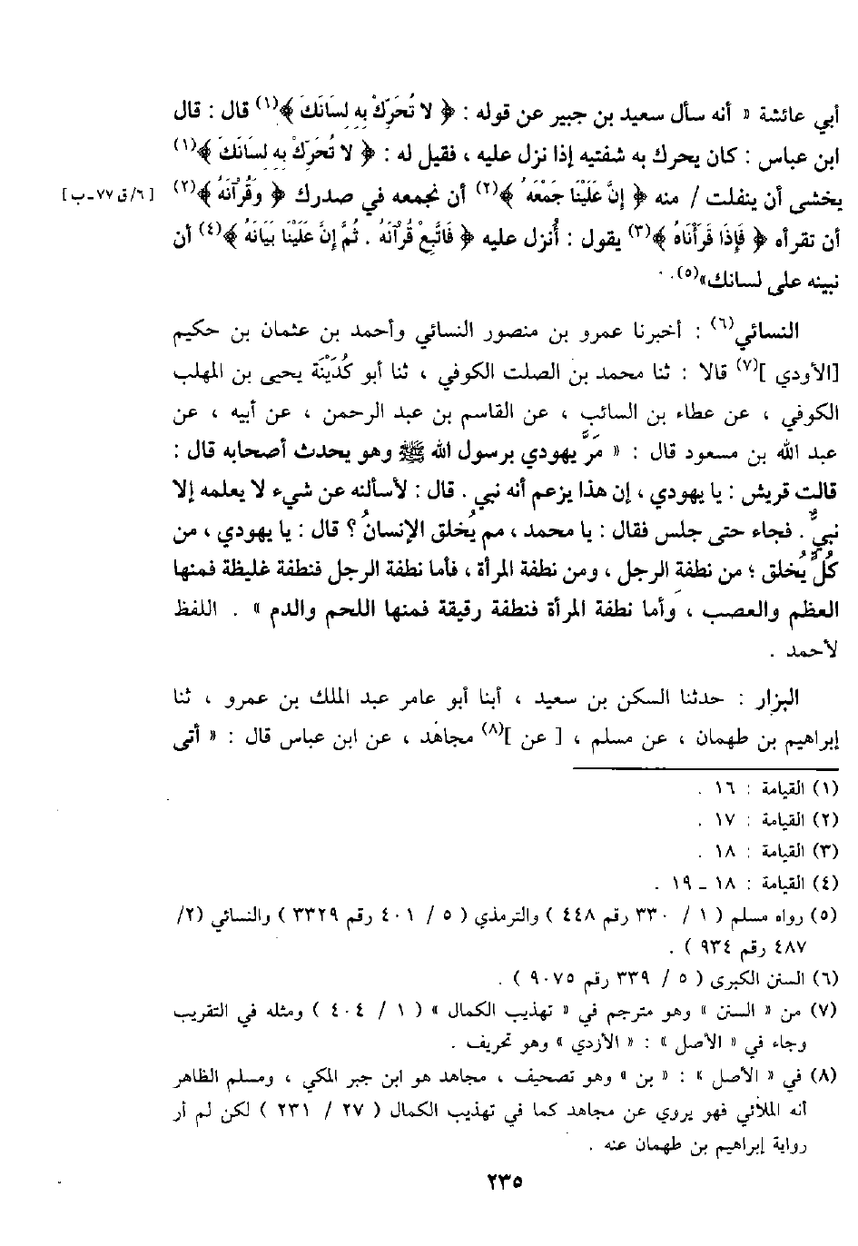 أبي عَائِشَة " أَنه سَأَلَ سعيد بن جُبَير عَن قَوْله: {لَا تحرّك بِهِ لسَانك} قَالَ: قَالَ ابْن عَبَّاس: كَانَ يُحَرك بِهِ شَفَتَيْه إِذا نزل عَلَيْهِ، فَقيل لَهُ: {لَا تحرّك بِهِ لسَانك} يخْشَى أَن ينفلت / مِنْهُ {إِن علينا جمعه} أَن نجمعه فِي صدرك {وقرآنه} أَن تَقْرَأهُ {فَإِذا قرأناه} يَقُول: أنزل عَلَيْهِ {فَاتبع قرآنه. ثمَّ إِن علينا بَيَانه} أَن نبينه على لسَانك ".