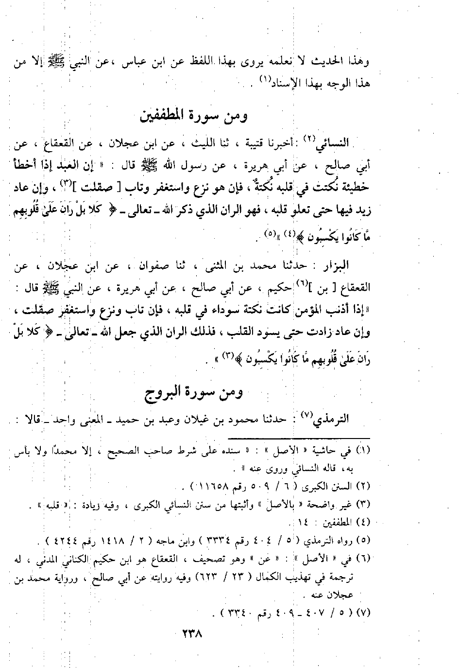 النَّسَائِيّ: أخبرنَا قُتَيْبَة، ثَنَا اللَّيْث، عَن ابْن عجلَان، عَن الْقَعْقَاع، عَن أبي صَالح، عَن أبي هُرَيْرَة، عَن رَسُول الله - صَلَّى اللَّهُ عَلَيْهِ وَسَلَّم َ - قَالَ: " إِن العَبْد إِذا أَخطَأ خَطِيئَة نكتت فِي قلبه نُكْتَة، فَإِن هُوَ نزع واستغفر وَتَابَ [صقلت] ، وَإِن عَاد زيد فِيهَا حَتَّى تعلو قلبه، فَهُوَ الران الَّذِي ذكر الله - تَعَالَى - {كلا بل ران على قُلُوبهم مَا كَانُوا يَكْسِبُونَ} ".
