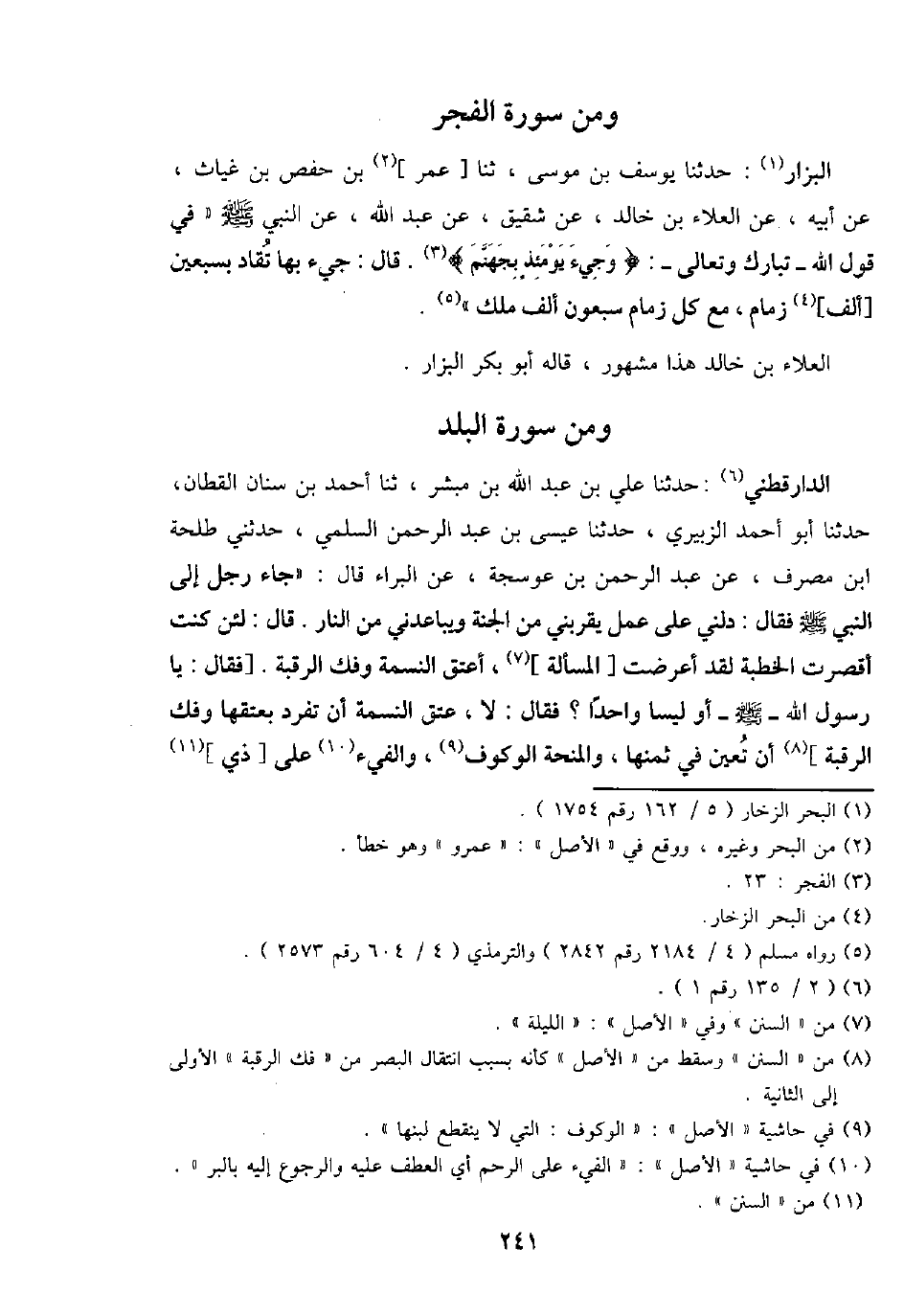 الدَّارَقُطْنِيّ: حَدثنَا عَليّ بن عبد الله بن مُبشر، ثَنَا أَحْمد بن سِنَان الْقطَّان، حَدثنَا أَبُو أَحْمد الزبيرِي، حَدثنَا عِيسَى بن عبد الرَّحْمَن السّلمِيّ، حَدثنِي طَلْحَة ابْن مصرف، عَن عبد الرَّحْمَن بن عَوْسَجَة، عَن الْبَراء قَالَ: " جَاءَ رجل إِلَى النَّبِي - صَلَّى اللَّهُ عَلَيْهِ وَسَلَّم َ - فَقَالَ: دلَّنِي على عمل يقربنِي من الْجنَّة وَيُبَاعِدنِي من النَّار. قَالَ: لَئِن كنت أقصرت الْخطْبَة لقد أَعرَضت [الْمَسْأَلَة] ، أعتق النَّسمَة وَفك الرَّقَبَة. [فَقَالَ: يَا رَسُول الله - - صَلَّى اللَّهُ عَلَيْهِ وَسَلَّم َ - أَو ليسَا وَاحِدًا؟ فَقَالَ: لَا، عتق النَّسمَة أَن تفرد بِعتْقِهَا وَفك الرَّقَبَة] أَن تعين فِي ثمنهَا، والمنحة الوكوف، والفيء على [ذِي]