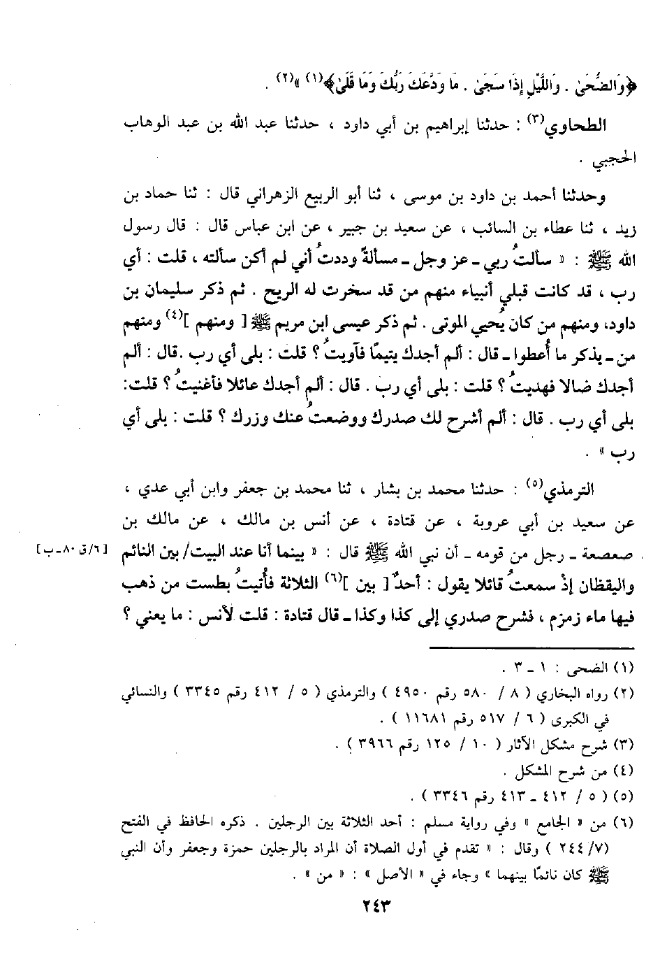 التِّرْمِذِيّ: حَدثنَا مُحَمَّد بن بشار، ثَنَا مُحَمَّد بن جَعْفَر وَابْن أبي عدي، عَن سعيد بن أبي عرُوبَة، عَن قَتَادَة، عَن أنس بن مَالك، عَن مَالك بن صعصعة - رجل من قومه - أَن نَبِي الله - صَلَّى اللَّهُ عَلَيْهِ وَسَلَّم َ - قَالَ: " بَيْنَمَا أَنا عِنْد الْبَيْت / بَين النَّائِم وَالْيَقظَان إِذْ سَمِعت قَائِلا يَقُول: أحد [بَين] الثَّلَاثَة فَأتيت بطست من ذهب فِيهَا مَاء زَمْزَم، فشرح صَدْرِي إِلَى كَذَا وَكَذَا - قَالَ قَتَادَة: قلت لأنس: مَا يَعْنِي؟