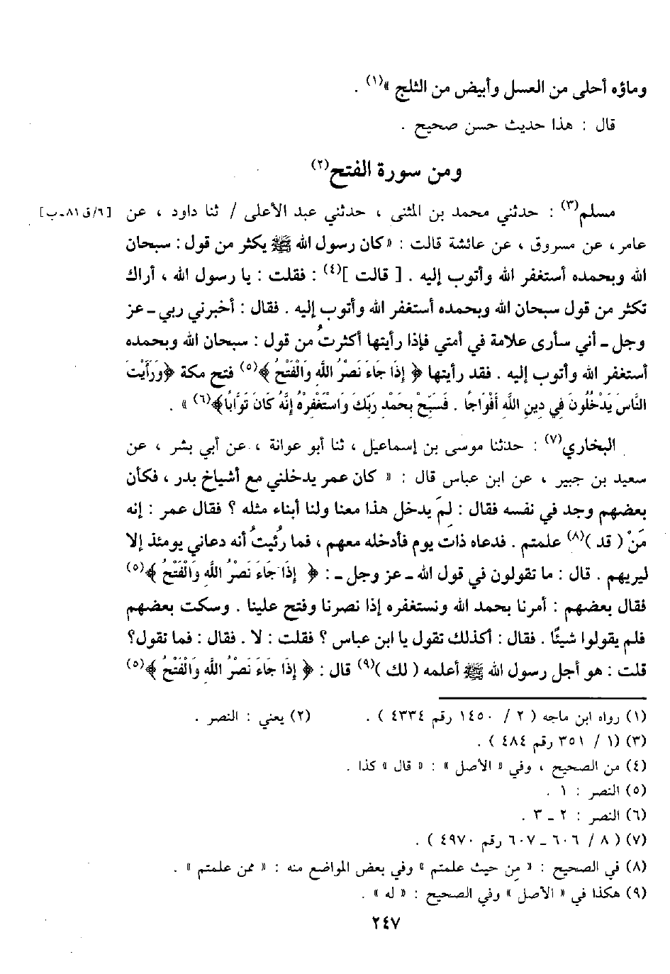 مُسلم: حَدثنِي مُحَمَّد بن الْمثنى، حَدثنِي عبد الْأَعْلَى / ثَنَا دَاوُد، عَن عَامر، عَن مَسْرُوق، عَن عَائِشَة قَالَت: " كَانَ رَسُول الله - صَلَّى اللَّهُ عَلَيْهِ وَسَلَّم َ - يكثر من قَول: سُبْحَانَ الله وَبِحَمْدِهِ أسْتَغْفر الله وَأَتُوب إِلَيْهِ. [قَالَت] : فَقلت: يَا رَسُول الله، أَرَاك تكْثر من قَول سُبْحَانَ الله وَبِحَمْدِهِ أسْتَغْفر الله وَأَتُوب إِلَيْهِ. فَقَالَ: أَخْبرنِي رَبِّي - عز وَجل - أَنِّي سأرى عَلامَة فِي أمتِي فَإِذا رَأَيْتهَا أكثرت من قَول: سُبْحَانَ الله وَبِحَمْدِهِ أسْتَغْفر الله وَأَتُوب إِلَيْهِ. فقد رَأَيْتهَا {إِذا جَاءَ نصر الله وَالْفَتْح} فتح مَكَّة {وَرَأَيْت النَّاس يدْخلُونَ فِي دين الله أَفْوَاجًا. فسبح بِحَمْد رَبك وَاسْتَغْفرهُ إِنَّه كَانَ تَوَّابًا} ".