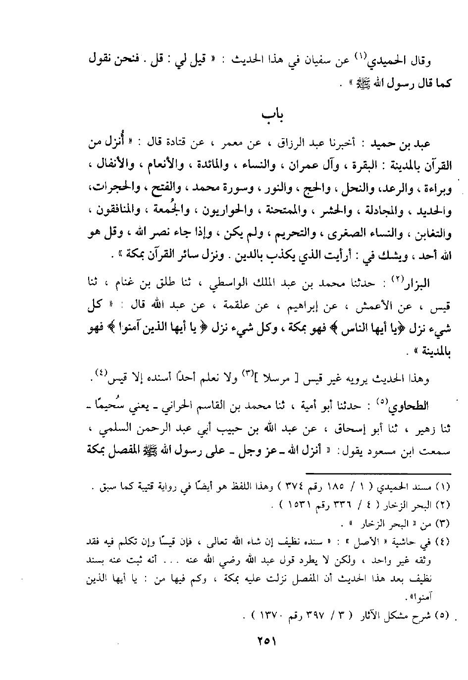 الطَّحَاوِيّ: حَدثنَا أَبُو أُميَّة، ثَنَا مُحَمَّد بن الْقَاسِم الْحَرَّانِي - يَعْنِي سحيما - ثَنَا زُهَيْر، ثَنَا أَبُو إِسْحَاق، عَن عبد الله بن حبيب أبي عبد الرَّحْمَن السّلمِيّ، سَمِعت ابْن مَسْعُود يَقُول: " أنزل الله - عز وَجل - على رَسُول الله - صَلَّى اللَّهُ عَلَيْهِ وَسَلَّم َ - الْمفصل بِمَكَّة