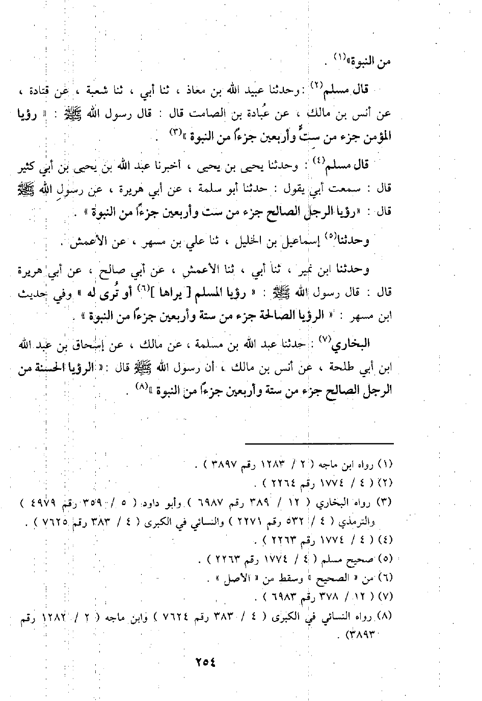 البُخَارِيّ: حَدثنَا عبد الله بن مسلمة، عَن مَالك، عَن إِسْحَاق بن عبد الله ابْن أبي طَلْحَة، عَن أنس بن مَالك، أَن رَسُول الله - صَلَّى اللَّهُ عَلَيْهِ وَسَلَّم َ - قَالَ: " الرُّؤْيَا الْحَسَنَة من الرجل الصَّالح جُزْء من سِتَّة وَأَرْبَعين جُزْءا من النُّبُوَّة ".