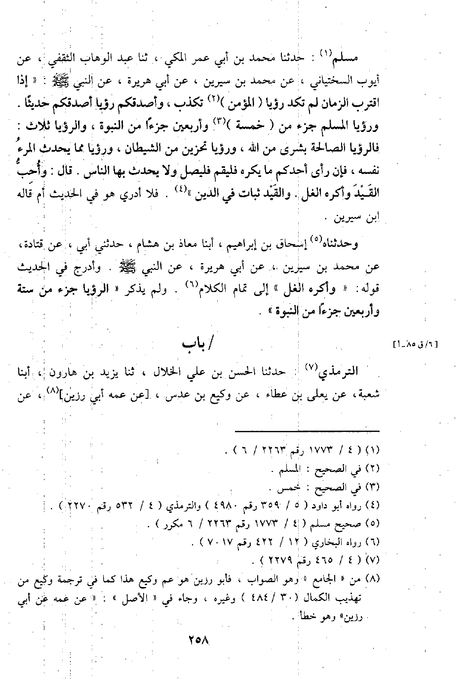 مُسلم: حَدثنَا مُحَمَّد بن أبي عمر الْمَكِّيّ، ثَنَا عبد الْوَهَّاب الثَّقَفِيّ، عَن أَيُّوب السّخْتِيَانِيّ، عَن مُحَمَّد بن سِيرِين، عَن أبي هُرَيْرَة، عَن النَّبِي - صَلَّى اللَّهُ عَلَيْهِ وَسَلَّم َ -: " إِذا اقْترب الزَّمَان لم تكد رُؤْيا (الْمُؤمن) تكذب، وأصدقكم رُؤْيا أصدقكم حَدِيثا. ورؤيا الْمُسلم جُزْء من (خَمْسَة) وَأَرْبَعين جُزْءا من النُّبُوَّة، والرؤيا ثَلَاث: فالرؤيا الصَّالِحَة بشرى من الله، ورؤيا تحزين من الشَّيْطَان، ورؤيا مِمَّا يحدث الْمَرْء نَفسه، فَإِن رأى أحدكُم مَا يكره فلقيم فَليصل وَلَا يحدث بهَا النَّاس. قَالَ: وَأحب الْقَيْد وأكره الغل. الْقَيْد ثبات فِي الدَّين ". فَلَا أَدْرِي هُوَ فِي الحَدِيث أم قَالَه ابْن سِيرِين.