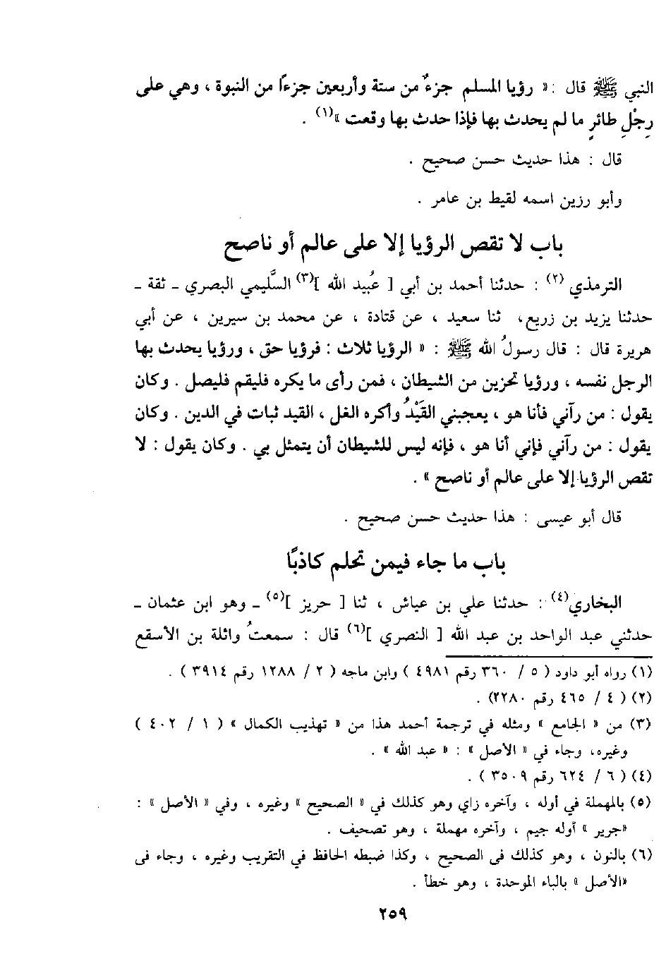 التِّرْمِذِيّ: حَدثنَا أَحْمد بن أبي [عبيد الله] السليمي الْبَصْرِيّ - ثِقَة - حَدثنَا يزِيد بن زُرَيْع، ثَنَا سعيد، عَن قَتَادَة، عَن مُحَمَّد بن سِيرِين، عَن أبي هُرَيْرَة قَالَ: قَالَ رَسُول الله - صَلَّى اللَّهُ عَلَيْهِ وَسَلَّم َ -: " الرُّؤْيَا ثَلَاث: فرؤيا حق، ورؤيا يحدث بهَا الرجل نَفسه، ورؤيا تحزين من الشَّيْطَان، فَمن رأى مَا يكره فَليقمْ فَليصل. وَكَانَ يَقُول: من رَآنِي فَأَنا هُوَ، يُعجبنِي الْقَيْد وأكره الغل، الْقَيْد ثبات فِي الدَّين. وَكَانَ يَقُول: من رَآنِي فَإِنِّي أَنا هُوَ، فَإِنَّهُ لَيْسَ للشَّيْطَان أَن يتَمَثَّل بِي. وَكَانَ يَقُول: لَا تقص الرُّؤْيَا إِلَّا على عَالم أَو نَاصح ".