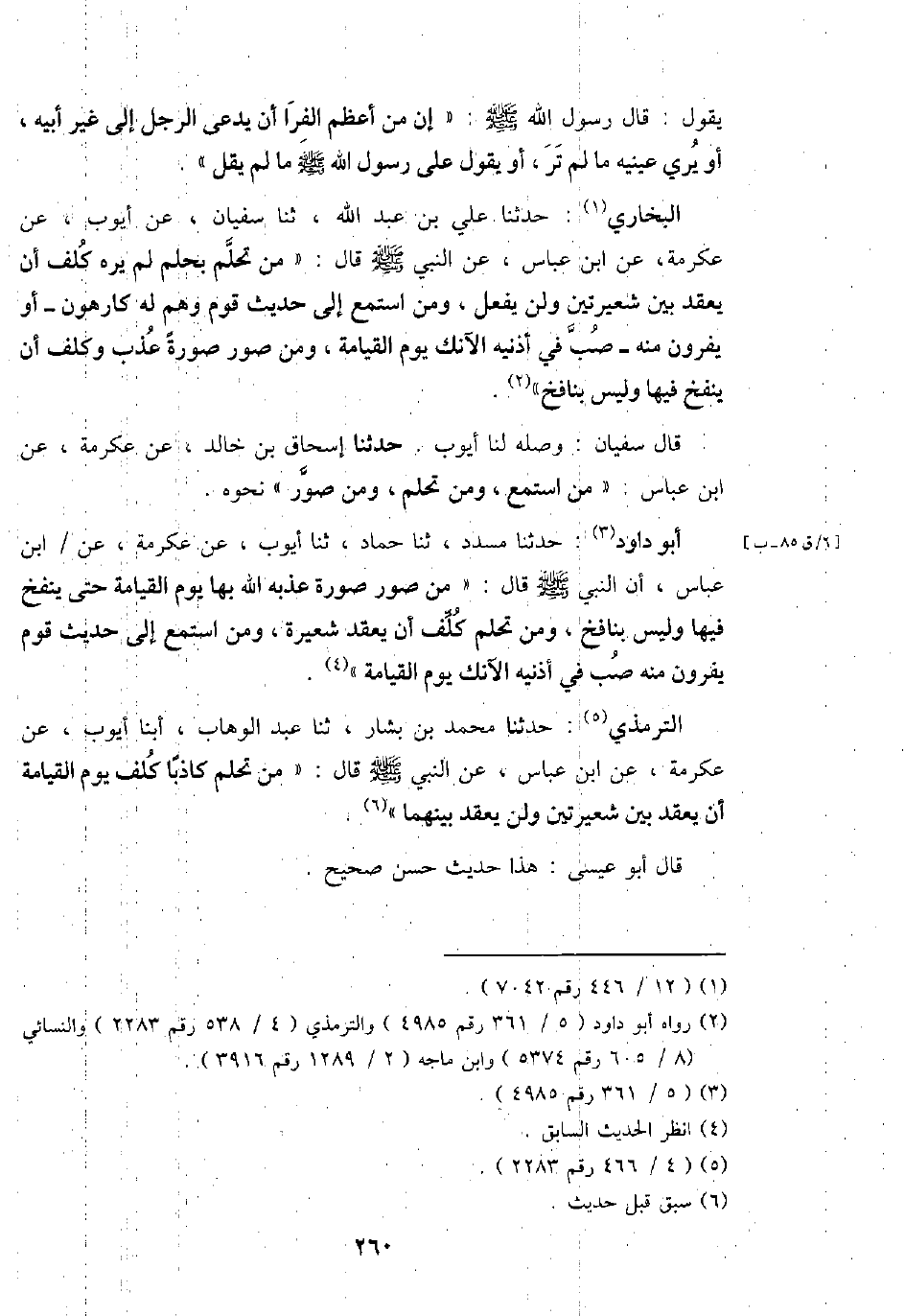 البُخَارِيّ: حَدثنَا عَليّ بن عبد الله، ثَنَا سُفْيَان، عَن أَيُّوب، عَن عِكْرِمَة، عَن ابْن عَبَّاس، عَن النَّبِي - صَلَّى اللَّهُ عَلَيْهِ وَسَلَّم َ - قَالَ: " من تحلم بحلم لم يره كلف أَن يعْقد بَين شعيرتين وَلنْ يفعل، وَمن اسْتمع إِلَى حَدِيث قوم وهم لَهُ كَارِهُون - أَو يفرون مِنْهُ - صب فِي أُذُنَيْهِ الآنك يَوْم الْقِيَامَة، وَمن صور صُورَة عذب وكلف أَن ينْفخ فِيهَا وَلَيْسَ بنافخ ".