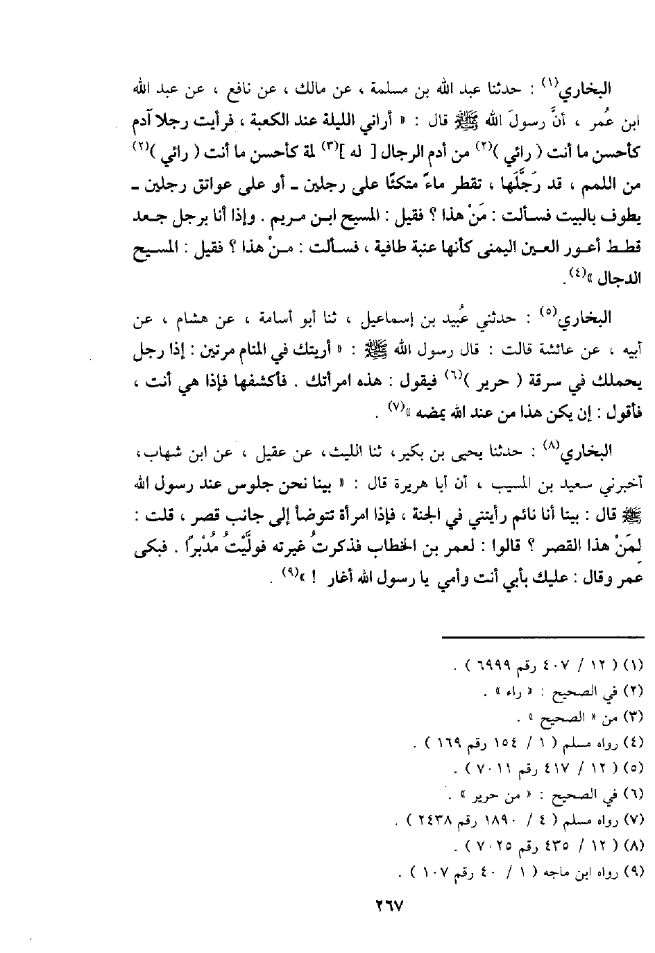البُخَارِيّ: حَدثنَا عبد الله بن مسلمة، عَن مَالك، عَن نَافِع، عَن عبد الله ابْن عمر، أَن رَسُول الله - صَلَّى اللَّهُ عَلَيْهِ وَسَلَّم َ - قَالَ: " أَرَانِي اللَّيْلَة عِنْد الْكَعْبَة، فَرَأَيْت رجلا آدم كأحسن مَا أَنْت (رائي) من أَدَم الرِّجَال [لَهُ] لمة كأحسن مَا أَنْت (رائي) من اللمم، قد رجلهَا، تقطر مَاء مُتكئا على رجلَيْنِ - أَو على عواتق رجلَيْنِ - يطوف بِالْبَيْتِ فَسَأَلت: من هَذَا؟ فَقيل: الْمَسِيح ابْن مَرْيَم. وَإِذا أَنا بِرَجُل جعد قطط أَعور الْعين الْيُمْنَى كَأَنَّهَا عنبة طافية، فَسَأَلت: من هَذَا؟ فَقيل: الْمَسِيح الدَّجَّال ".