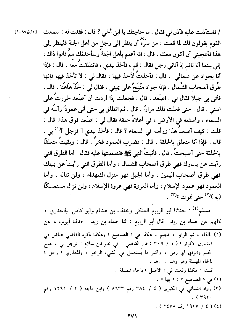 / فاستأذنت عَلَيْهِ فَأذن لي فَقَالَ: مَا حَاجَتك يَا ابْن أخي؟ قَالَ: فَقلت لَهُ: سَمِعت الْقَوْم يَقُولُونَ لَك لما قُمْت: من سره أَن ينظر إِلَى رجل من أهل الْجنَّة فَلْينْظر إِلَى هَذَا فَأَعْجَبَنِي أَن أكون مَعَك. قَالَ: الله أعلم بِأَهْل الْجنَّة وسأحدثك مِم قَالُوا ذَاك، إِنِّي بَيْنَمَا أَنا نَائِم إِذا أَتَانِي رجل فَقَالَ: قُم، فَأخذ بيَدي، فَانْطَلَقت مَعَه. قَالَ: فَإِذا أَنا بجواد عَن شمَالي. قَالَ: فَأخذت لآخذ فِيهَا، فَقَالَ لي: لَا تَأْخُذ فِيهَا فَإِنَّهَا طرق أَصْحَاب الشمَال. فَإِذا جواد مَنْهَج على يَمِيني، فَقَالَ لي: خُذ هَاهُنَا. قَالَ: فَأتى بِي جبلا فَقَالَ لي: اصْعَدْ. قَالَ: فَجعلت إِذا أردْت أَن أصعد خَرَرْت على استي. قَالَ: حَتَّى فعلت ذَلِك مرَارًا. قَالَ: ثمَّ انْطلق بِي حَتَّى أَتَى عمودا رَأسه فِي السَّمَاء، وأسفله فِي الأَرْض، فِي أَعْلَاهُ حَلقَة فَقَالَ لي: اصْعَدْ فَوق هَذَا. قَالَ: قلت: كَيفَ أصعد هَذَا وَرَأسه فِي السَّمَاء؟ قَالَ: فَأخذ بيَدي [فزجل] بِي. قَالَ: فَإِذا أَنا مُتَعَلق بالحلقة. قَالَ: فَضرب العمود فَخر. قَالَ: وَبقيت مُتَعَلقا بالحلقة حَتَّى أَصبَحت. قَالَ: فَأتيت النَّبِي - صَلَّى اللَّهُ عَلَيْهِ وَسَلَّم َ - فقصصتها عَلَيْهِ فَقَالَ: أما الطّرق الَّتِي رَأَيْت عَن يسارك فَهِيَ طرق أَصْحَاب الشمَال، وَأما الطّرق الَّتِي رَأَيْت عَن يَمِينك فَهِيَ طرق أَصْحَاب الْيَمين، وَأما الْجَبَل فَهُوَ منزل الشُّهَدَاء، وَلنْ تناله، وَأما العمود فَهُوَ عَمُود الْإِسْلَام، وَأما العروة فَهِيَ عُرْوَة الْإِسْلَام، وَلنْ تزَال مستمسكا (بِهِ) حَتَّى تَمُوت ".