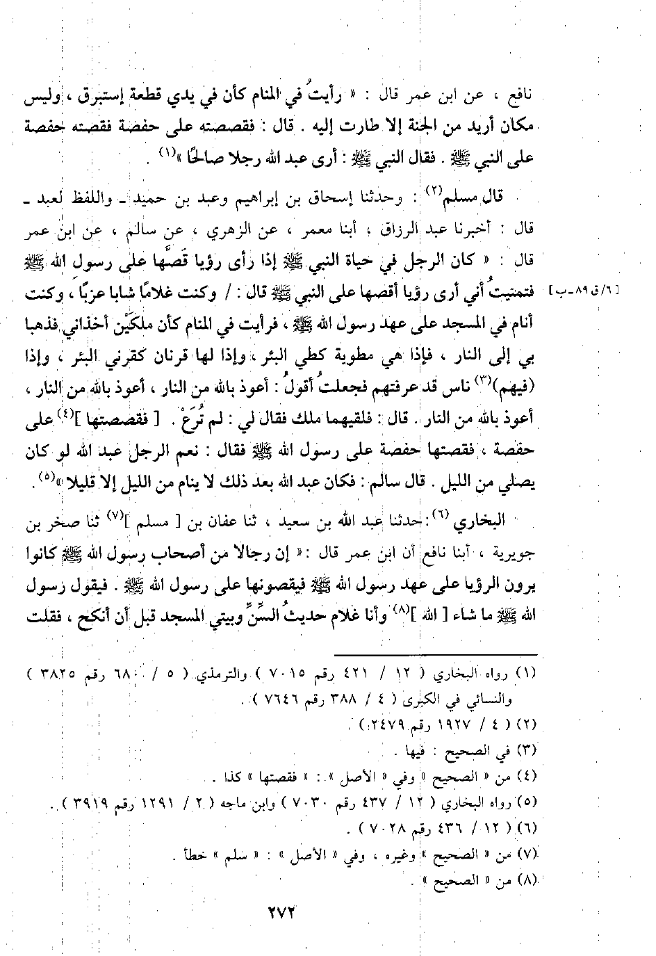 قَالَ مُسلم: وَحدثنَا إِسْحَاق بن إِبْرَاهِيم وَعبد بن حميد - وَاللَّفْظ لعبد - قَالَ: أخبرنَا عبد الرَّزَّاق، أبنا معمر، عَن الزُّهْرِيّ، عَن سَالم، عَن ابْن عمر قَالَ: " كَانَ الرجل فِي حَيَاة النَّبِي - صَلَّى اللَّهُ عَلَيْهِ وَسَلَّم َ - إِذا رأى رُؤْيا قصها على رَسُول الله - صَلَّى اللَّهُ عَلَيْهِ وَسَلَّم َ - فتمنيت أَنِّي أرى رُؤْيا أقصها على النَّبِي - صَلَّى اللَّهُ عَلَيْهِ وَسَلَّم َ - قَالَ: / وَكنت غُلَاما شَابًّا عزبا، وَكنت أَنَام فِي الْمَسْجِد على عهد رَسُول الله - صَلَّى اللَّهُ عَلَيْهِ وَسَلَّم َ -، فَرَأَيْت فِي الْمَنَام كَأَن ملكَيْنِ أخذاني فذهبا بِي إِلَى النَّار، فَإِذا هِيَ مطوية كطي الْبِئْر، وَإِذا لَهَا قرنان كقرني الْبِئْر، وَإِذا (فيهم) نَاس قد عرفتهم فَجعلت أَقُول: أعوذ بِاللَّه من النَّار، أعوذ بِاللَّه من النَّار، أعوذ بِاللَّه من النَّار. قَالَ: فلقيهما ملك فَقَالَ لي: لم ترع. [فقصصتها] على حَفْصَة، فقصتها حَفْصَة على رَسُول الله - صَلَّى اللَّهُ عَلَيْهِ وَسَلَّم َ - فَقَالَ: نعم الرجل عبد الله لَو كَانَ يُصَلِّي من اللَّيْل. قَالَ سَالم: فَكَانَ عبد الله بعد ذَلِك لَا ينَام من اللَّيْل إِلَّا قَلِيلا ".