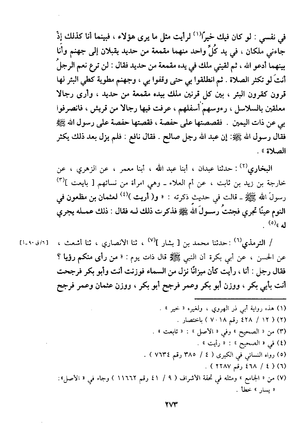 / التِّرْمِذِيّ: حَدثنَا مُحَمَّد بن [بشار] ، ثَنَا الْأنْصَارِيّ، ثَنَا أَشْعَث، عَن الْحسن، عَن أبي بكرَة أَن النَّبِي - صَلَّى اللَّهُ عَلَيْهِ وَسَلَّم َ - قَالَ ذَات يَوْم: " من رأى مِنْكُم رُؤْيا؟ فَقَالَ رجل: أَنا رَأْيك كَأَن ميزانا نزل من السَّمَاء فوزنت أَنْت وَأَبُو بكر فرجحت أَنْت بِأبي بكر، وَوزن أَبُو بكر وَعمر فرجح أَبُو بكر، وَوزن عُثْمَان وَعمر فرجح