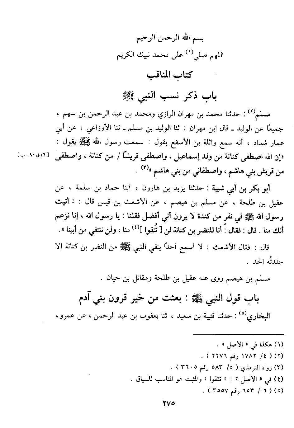 مُسلم: حَدثنَا مُحَمَّد بن مهْرَان الرَّازِيّ وَمُحَمّد بن عبد الرَّحْمَن بن سهم، جَمِيعًا عَن الْوَلِيد - قَالَ ابْن مهْرَان: ثَنَا الْوَلِيد بن مُسلم - ثَنَا الْأَوْزَاعِيّ، عَن أبي عمار شَدَّاد، أَنه سمع وَاثِلَة بن الْأَسْقَع يَقُول: سَمِعت رَسُول الله - صَلَّى اللَّهُ عَلَيْهِ وَسَلَّم َ - يَقُول: " إِن الله اصْطفى كنَانَة من ولد إِسْمَاعِيل، وَاصْطفى قُريْشًا / من كنَانَة، وَاصْطفى من قُرَيْش بني هَاشم، وَاصْطَفَانِي من بني هَاشم ".