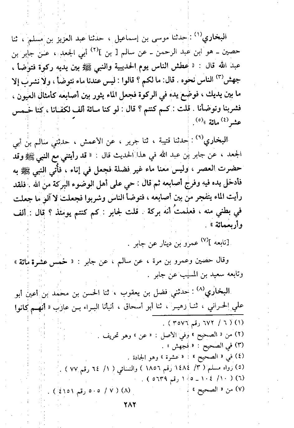 البُخَارِيّ: حَدثنَا مُوسَى بن إِسْمَاعِيل، حَدثنَا عبد الْعَزِيز بن مُسلم، ثَنَا حُصَيْن - هُوَ ابْن عبد الرَّحْمَن - عَن سَالم [بن] أبي الْجَعْد، عَن جَابر بن عبد الله قَالَ: " عَطش النَّاس يَوْم الْحُدَيْبِيَة وَالنَّبِيّ - صَلَّى اللَّهُ عَلَيْهِ وَسَلَّم َ - بَين يَدَيْهِ ركوة فَتَوَضَّأ، جهش النَّاس نَحوه، قَالَ: مَا لكم؟ قَالُوا: لَيْسَ عندنَا مَاء نَتَوَضَّأ، وَلَا نشرب إِلَّا مَا بَين يَديك، فَوضع يَده فِي الركوة فَجعل المَاء يثور بَين أَصَابِعه كأمثال الْعُيُون، فشربنا وتوضأنا. قلت: كم كُنْتُم؟ قَالَ: لَو كُنَّا مائَة ألف لَكَفَانَا، كُنَّا خمس عشر مائَة ".