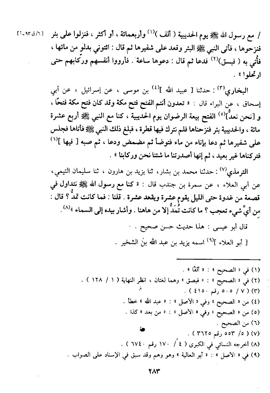 البُخَارِيّ: حَدثنَا [عبيد الله] بن مُوسَى، عَن إِسْرَائِيل، عَن أبي إِسْحَاق، عَن الْبَراء قَالَ: " تَعدونَ أَنْتُم الْفَتْح فتح مَكَّة وَقد كَانَ فتح مَكَّة فتحا، و [نَحن نعد] الْفَتْح بيعَة الرضْوَان يَوْم الْحُدَيْبِيَة، كُنَّا مَعَ النَّبِي - صَلَّى اللَّهُ عَلَيْهِ وَسَلَّم َ - أَربع عشرَة مائَة، وَالْحُدَيْبِيَة بِئْر فنزحناها فَلم نَتْرُك فِيهَا قَطْرَة، فَبلغ ذَلِك النَّبِي - صَلَّى اللَّهُ عَلَيْهِ وَسَلَّم َ - فَأَتَاهَا فَجَلَسَ على شفيرها ثمَّ دَعَا بِإِنَاء من مَاء فَتَوَضَّأ ثمَّ مضمض ودعا، ثمَّ صبه [فِيهَا] فتركناها غير بعيد، ثمَّ إِنَّهَا أصدرتنا مَا شِئْنَا نَحن وركابنا ".