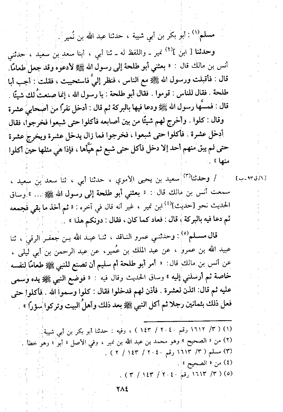 وَحدثنَا [ابْن] نمير - وَاللَّفْظ لَهُ - ثَنَا أبي، أبنا سعد بن سعيد، حَدثنِي أنس بن مَالك قَالَ: " بَعَثَنِي أَبُو طَلْحَة إِلَى رَسُول الله - صَلَّى اللَّهُ عَلَيْهِ وَسَلَّم َ - لأدعوه وَقد جعل طَعَاما. قَالَ: فَأَقْبَلت وَرَسُول الله - صَلَّى اللَّهُ عَلَيْهِ وَسَلَّم َ - مَعَ النَّاس، فَنظر إِلَيّ فَاسْتَحْيَيْت، فَقلت: أجب أَبَا طَلْحَة. فَقَالَ للنَّاس: قومُوا: فَقَالَ أَبُو طَلْحَة: يَا رَسُول الله، إِنَّمَا صنعت لَك شَيْئا. قَالَ: فمسها رَسُول الله - صَلَّى اللَّهُ عَلَيْهِ وَسَلَّم َ - ودعا فِيهَا بِالْبركَةِ ثمَّ قَالَ: أَدخل نَفرا من أَصْحَابِي عشرَة وَقَالَ: كلوا. وَأخرج لَهُم شَيْئا من بَين أَصَابِعه فَأَكَلُوا حَتَّى شَبِعُوا فَخَرجُوا، فَقَالَ أَدخل عشرَة. فَأَكَلُوا حَتَّى شَبِعُوا، فَخَرجُوا فَمَا زَالَ يدْخل عشرَة وَيخرج عشرَة حَتَّى لم يبْق مِنْهُم أحد إِلَّا دخل فَأكل حَتَّى شبع ثمَّ هيأها، فَإِذا هِيَ مثلهَا حِين أكلُوا مِنْهَا ".