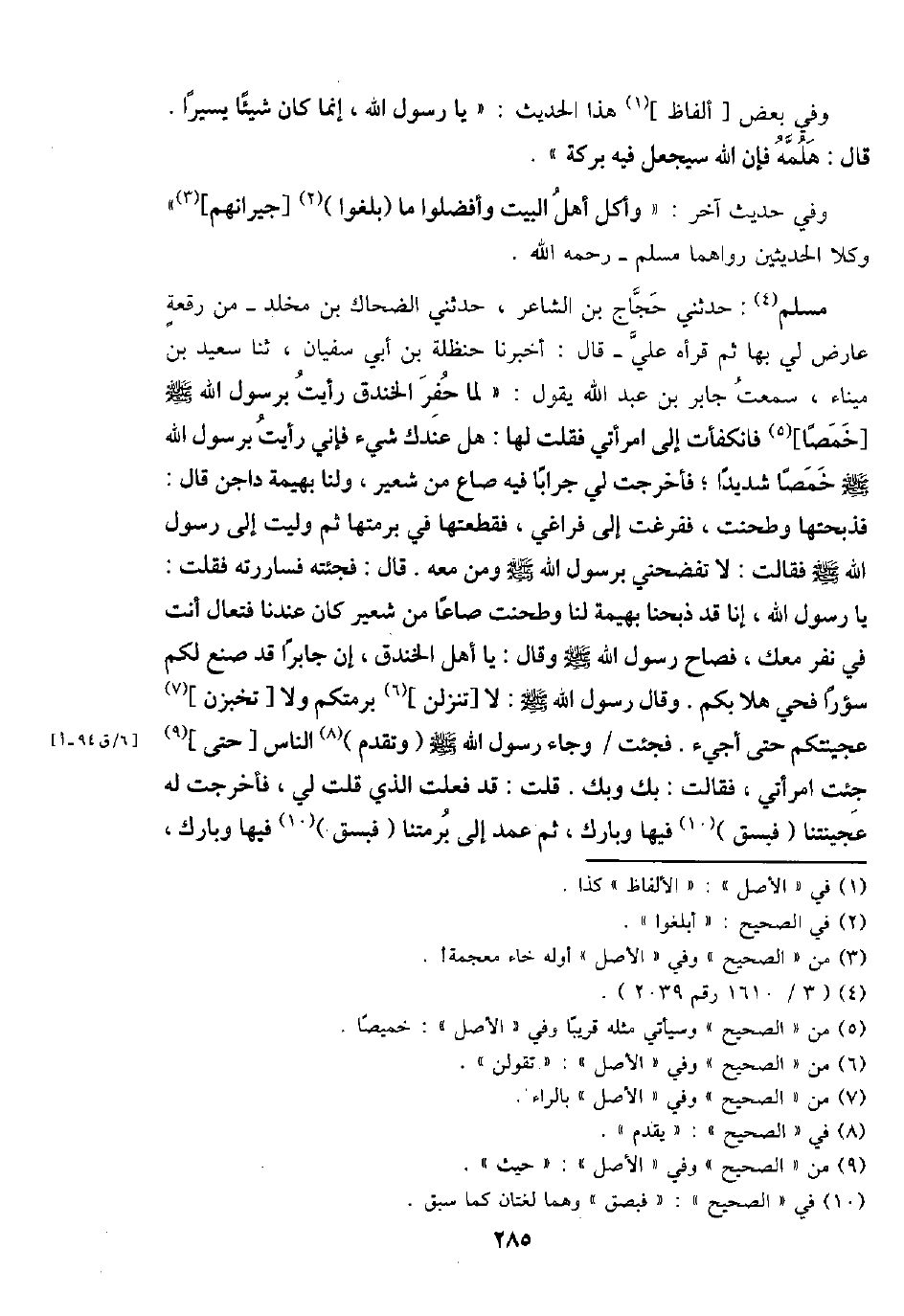 مُسلم: حَدثنِي حجاج بن الشَّاعِر، حَدثنِي الضَّحَّاك بن مخلد - من رقْعَة عَارض لي بهَا ثمَّ قَرَأَهُ عَليّ - قَالَ: أخبرنَا حَنْظَلَة بن أبي سُفْيَان، ثَنَا سعيد بن ميناء، سَمِعت جَابر بن عبد الله يَقُول: " لما حفر الخَنْدَق رَأَيْت برَسُول الله - صَلَّى اللَّهُ عَلَيْهِ وَسَلَّم َ -[خمصا] فَانْكَفَأت إِلَى امْرَأَتي فَقلت لَهَا: هَل عنْدك شَيْء فَإِنِّي رَأَيْت برَسُول الله - صَلَّى اللَّهُ عَلَيْهِ وَسَلَّم َ - خمصا شَدِيدا؛ فأخرجت لي جرابا فِيهِ صَاع من شعير، وَلنَا بَهِيمَة دَاجِن قَالَ: فذبحتها وطحنت، ففرغت إِلَى فراغي، فقطعتها فِي برمتها ثمَّ وليت إِلَى رَسُول الله - صَلَّى اللَّهُ عَلَيْهِ وَسَلَّم َ - فَقَالَت: لَا تفضحني برَسُول الله - صَلَّى اللَّهُ عَلَيْهِ وَسَلَّم َ - وَمن مَعَه. قَالَ: فَجِئْته فساررته فَقلت: يَا رَسُول الله، إِنَّا قد ذبحنا بَهِيمَة لنا وطحنت صَاعا من شعير كَانَ عندنَا فتعال أَنْت فِي نفر مَعَك، فصاح رَسُول الله - صَلَّى اللَّهُ عَلَيْهِ وَسَلَّم َ - وَقَالَ: يَا أهل الخَنْدَق، إِن جَابِرا قد صنع لكم سؤرا فحي هلا بكم. وَقَالَ رَسُول الله - صَلَّى اللَّهُ عَلَيْهِ وَسَلَّم َ - لَا [تنزلن] برمتكم وَلَا [تخبزن] عجينتكم حَتَّى أجيء. فَجئْت وَجَاء رَسُول الله - صَلَّى اللَّهُ عَلَيْهِ وَسَلَّم َ - (وَتقدم) النَّاس [حَتَّى] جِئْت امْرَأَتي، فَقَالَت: بك وَبِك. قلت: قد فعلت الَّذِي قلت لي، فأخرجت لَهُ عجينتنا (فبسق) فِيهَا وَبَارك، ثمَّ عمد إِلَى برمتنا (فبسق) فِيهَا وَبَارك،