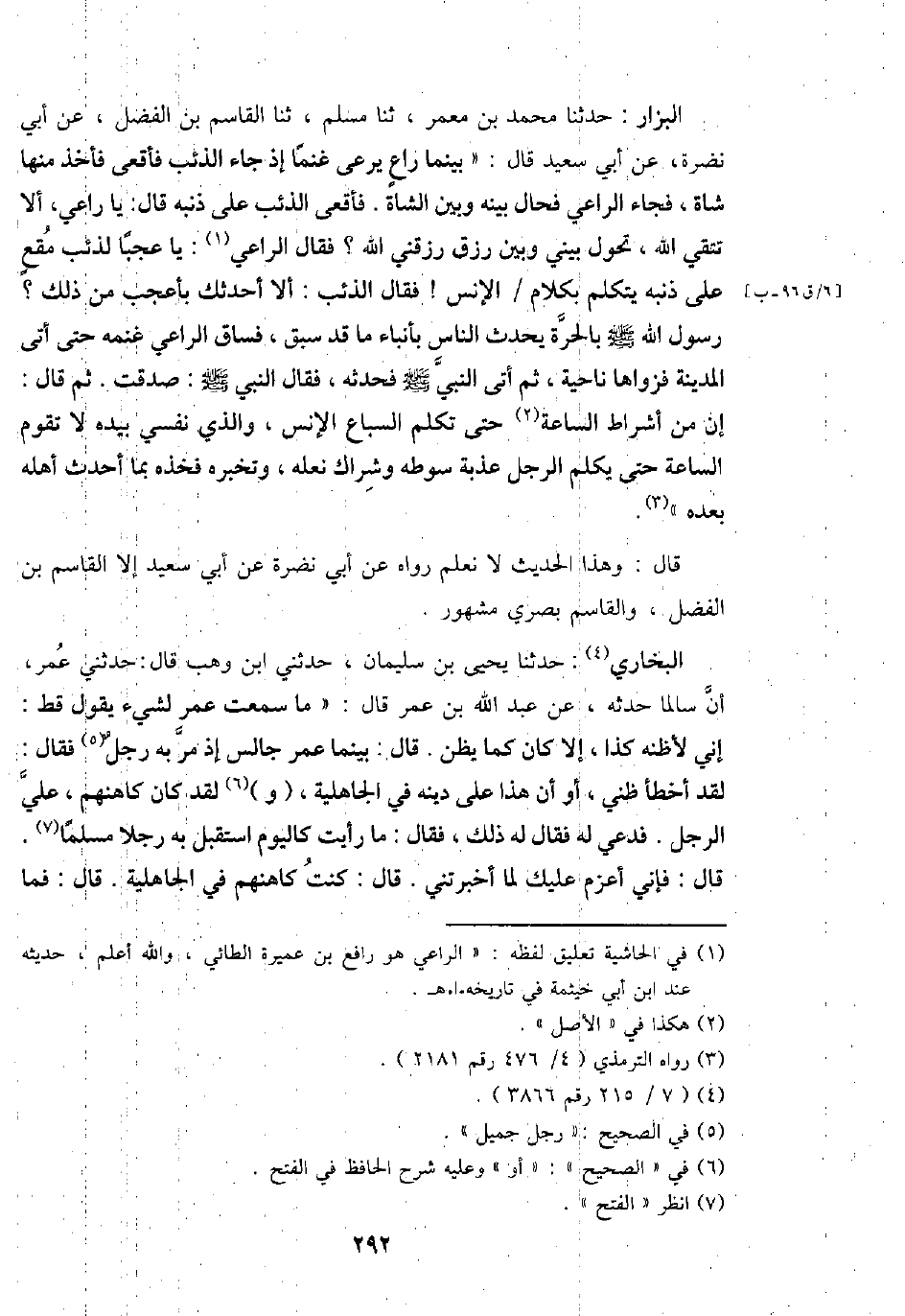 الْبَزَّار: حَدثنَا مُحَمَّد بن معمر، ثَنَا مُسلم، ثَنَا الْقَاسِم بن الْفضل، عَن أبي نَضرة، عَن أبي سعيد قَالَ: " بَيْنَمَا رَاع يرْعَى غنما إِذْ جَاءَ الذِّئْب فأقعى فَأخذ مِنْهَا شَاة، فجَاء الرَّاعِي فحال بَينه وَبَين الشَّاة. فأقعى الذِّئْب على ذَنبه قَالَ: يَا راعي، أَلا تتقي الله، تحول بيني وَبَين رزق رَزَقَنِي الله؟ فَقَالَ الرَّاعِي: يَا عجبا لذئب مقع على ذَنبه يتَكَلَّم بِكَلَام / الْإِنْس! فَقَالَ الذِّئْب: أَلا أحَدثك بِأَعْجَب من ذَلِك؟ رَسُول الله - صَلَّى اللَّهُ عَلَيْهِ وَسَلَّم َ - بِالْحرَّةِ يحدث النَّاس بأنباء مَا قد سبق، فساق الرَّاعِي غنمه حَتَّى أَتَى الْمَدِينَة فزواها نَاحيَة، ثمَّ أَتَى النَّبِي - صَلَّى اللَّهُ عَلَيْهِ وَسَلَّم َ - فحدثه، فَقَالَ النَّبِي - صَلَّى اللَّهُ عَلَيْهِ وَسَلَّم َ -: صدقت. ثمَّ قَالَ: إِن من أَشْرَاط السَّاعَة حَتَّى تكلم السبَاع الْإِنْس، وَالَّذِي نَفسِي بِيَدِهِ لَا تقوم السَّاعَة حَتَّى يكلم الرجل عذبة سَوْطه وشراك نَعله، وَتُخْبِرهُ فَخذه بِمَا أحدث أَهله بعده ".