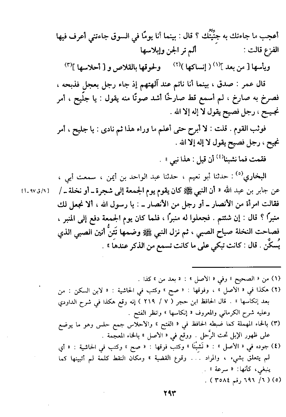 البُخَارِيّ: حَدثنَا أَبُو نعيم، حَدثنَا عبد الْوَاحِد بن أَيمن، سَمِعت أبي، عَن جَابر بن عبد الله " أَن النَّبِي - صَلَّى اللَّهُ عَلَيْهِ وَسَلَّم َ - كَانَ يقوم يَوْم الْجُمُعَة إِلَى شَجَرَة - أَو نَخْلَة - / فَقَالَت امْرَأَة من الْأَنْصَار - أَو رجل من الْأَنْصَار -: يَا رَسُول الله، أَلا نجْعَل لَك منبرا؟ قَالَ: إِن شِئْتُم. فَجعلُوا لَهُ منبرا، فَلَمَّا كَانَ يَوْم الْجُمُعَة دفع إِلَى الْمِنْبَر، فصاحت النَّخْلَة صياح الصَّبِي، ثمَّ نزل النَّبِي - صَلَّى اللَّهُ عَلَيْهِ وَسَلَّم َ - وَضمّهَا تَئِنُّ أَنِين الصَّبِي الَّذِي يسكن. قَالَ: كَانَت تبْكي على مَا كَانَت تسمع من الذّكر عِنْدهَا ".