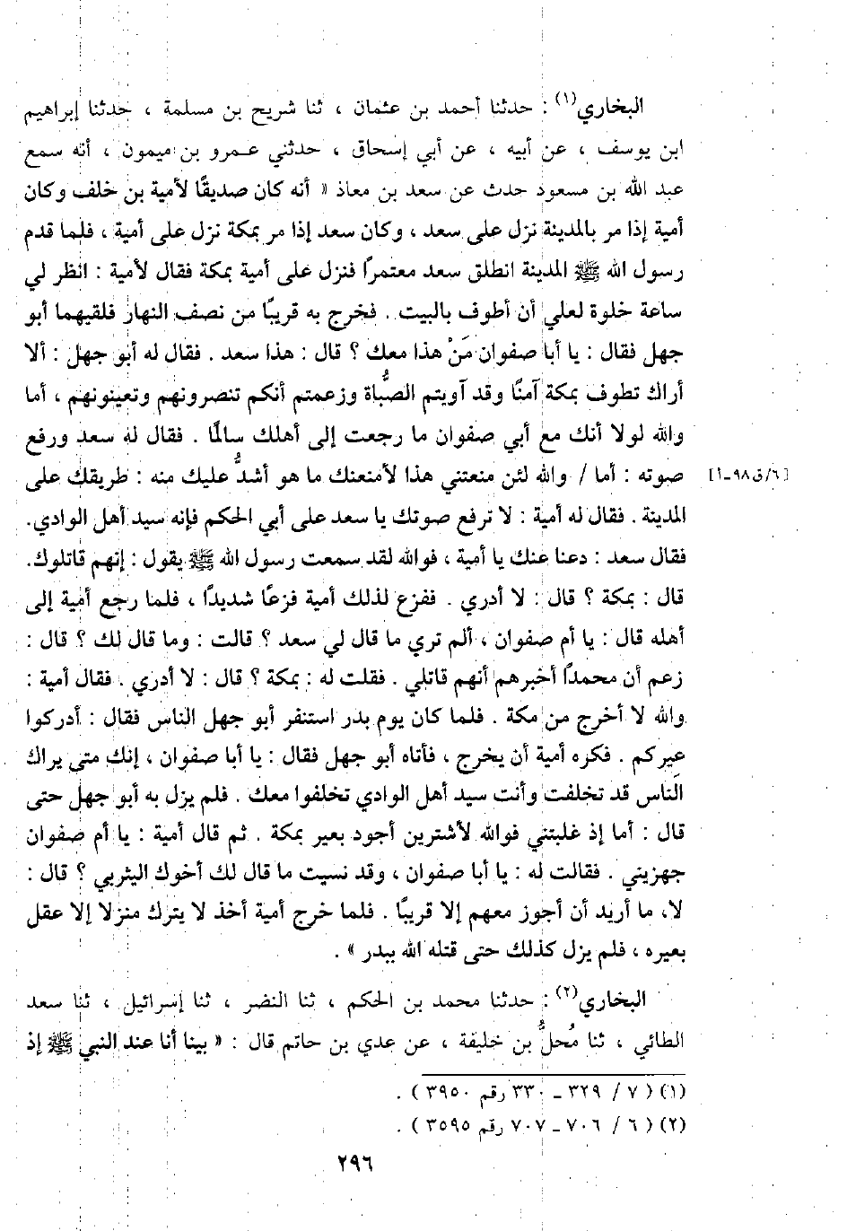 البُخَارِيّ: حَدثنَا أَحْمد بن عُثْمَان، ثَنَا شُرَيْح بن مسلمة، حَدثنَا إِبْرَاهِيم ابْن يُوسُف، عَن أَبِيه، عَن أبي إِسْحَاق، حَدثنِي عَمْرو بن مَيْمُون، أَنه سمع عبد الله بن مَسْعُود حدث عَن سعد بن معَاذ " أَنه كَانَ صديقا لأمية بن خلف وَكَانَ أُميَّة إِذا مر بِالْمَدِينَةِ نزل على سعد، وَكَانَ سعد إِذا مر بِمَكَّة نزل على أُميَّة، فَلَمَّا قدم رَسُول الله - صَلَّى اللَّهُ عَلَيْهِ وَسَلَّم َ - الْمَدِينَة انْطلق سعد مُعْتَمِرًا فَنزل على أُميَّة بِمَكَّة فَقَالَ لأمية: انْظُر لي سَاعَة خلْوَة لعَلي أَن أَطُوف بِالْبَيْتِ. فَخرج بِهِ قَرِيبا من نصف النَّهَار فلقيهما أَبُو جهل فَقَالَ: يَا أَبَا صَفْوَان من هَذَا مَعَك؟ قَالَ: هَذَا سعد. فَقَالَ لَهُ أَبُو جهل: أَلا أَرَاك تَطوف بِمَكَّة آمنا وَقد آويتم الصباة وزعمتم أَنكُمْ تنصرونهم وتعينونهم، أما وَالله لَوْلَا أَنَّك مَعَ أبي صَفْوَان مَا رجعت إِلَى أهلك سالما. فَقَالَ لَهُ سعد وَرفع صَوته: أما / وَالله لَئِن منعتني هَذَا لأمنعنك مَا هُوَ أَشد عَلَيْك مِنْهُ: طريقك على الْمَدِينَة. فَقَالَ لَهُ أُميَّة: لَا ترفع صَوْتك يَا سعد على أبي الحكم فَإِنَّهُ سيد أهل الْوَادي. فَقَالَ سعد: دَعْنَا عَنْك يَا أُميَّة. فوَاللَّه لقد سَمِعت رَسُول الله - صَلَّى اللَّهُ عَلَيْهِ وَسَلَّم َ - يَقُول: إِنَّهُم قاتلوك. قَالَ: بِمَكَّة؟ قَالَ: لَا أَدْرِي. فَفَزعَ لذَلِك أُميَّة فَزعًا شَدِيدا، فَلَمَّا رَجَعَ أُميَّة إِلَى أَهله قَالَ: يَا أم صَفْوَان، ألم تري مَا قَالَ لي سعد؟ قَالَ: وَمَا قَالَ لَك؟ قَالَ: زعم أَن مُحَمَّدًا أخْبرهُم أَنهم قاتلي. فَقلت لَهُ: بِمَكَّة؟ قَالَ: لَا أَدْرِي. فَقَالَ أُميَّة: وَالله لَا أخرج من مَكَّة. فَلَمَّا كَانَ يَوْم بدر اسْتنْفرَ أَبُو جهل النَّاس فَقَالَ: أدركوا عِيركُمْ. فكره أُميَّة أَن يخرج، فَأَتَاهُ أَبُو جهل فَقَالَ: يَا أَبَا صَفْوَان، إِنَّك مَتى يراك النَّاس قد تخلفت وَأَنت سيد أهل الْوَادي تخلفوا مَعَك. فَلم يزل بِهِ أَبُو جهل حَتَّى قَالَ: أما إِذا غلبتني فوَاللَّه لأشترين أَجود بعير بِمَكَّة. ثمَّ قَالَ أُميَّة: يَا أم صَفْوَان جهزيني. فَقَالَت لَهُ: يَا أَبَا صَفْوَان، وَقد نسيت مَا قَالَ لَك أَخُوك اليثربي؟ قَالَ: لَا، مَا أُرِيد أَن أجوز مَعَهم إِلَّا قَرِيبا. فَلَمَّا خرج أُميَّة أَخذ لَا يتْرك منزلا إِلَّا عقل بعيره، فَلم يزل كَذَلِك حَتَّى قَتله الله ببدر ".