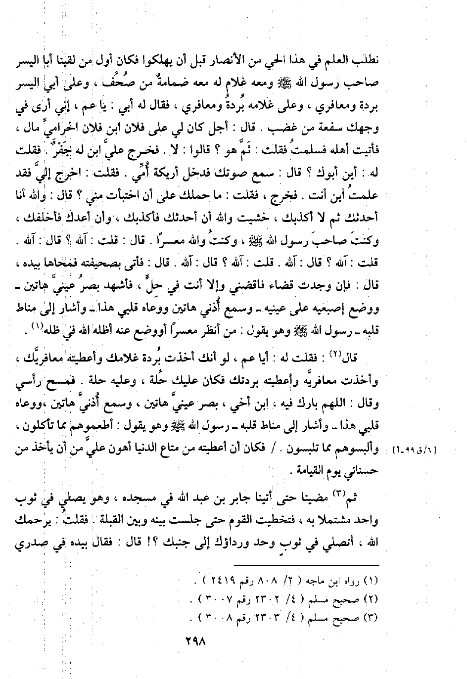 قَالَ: فَقلت لَهُ: أيا عَم، لَو أَنَّك أخذت بردة غلامك وأعطيته معافريك، وَأخذت معافرية وأعطيته بردتك فَكَانَ عَلَيْك حلَّة، وَعَلِيهِ حلَّة. فَمسح رَأْسِي وَقَالَ: اللَّهُمَّ بَارك فِيهِ، ابْن أخي، بصر عَيْني هَاتين، وَسمع أُذُنِي هَاتين، ووعاه قلبِي هَذَا - وَأَشَارَ إِلَى منَاط قلبه - رَسُول الله - صَلَّى اللَّهُ عَلَيْهِ وَسَلَّم َ - وَهُوَ يَقُول: أطعموهم مِمَّا تَأْكُلُونَ، وألبسوهم مِمَّا تلبسُونَ. / فَكَانَ أَن أَعْطيته من مَتَاع الدُّنْيَا أَهْون عَليّ من أَن يَأْخُذ من حسناتي يَوْم الْقِيَامَة.