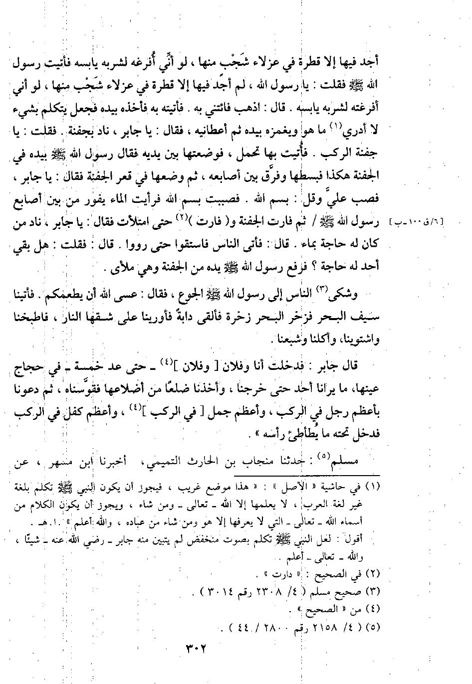 أجد فِيهَا إِلَّا قَطْرَة فِي عزلاء شجب مِنْهَا، لَو أَنِّي أفرغه لشربه يابسه فَأتيت رَسُول الله - صَلَّى اللَّهُ عَلَيْهِ وَسَلَّم َ - فَقلت: يَا رَسُول الله، لم أجد فِيهَا إِلَّا قَطْرَة فِي عزلاء شجب مِنْهَا، لَو أَنِّي أفرغته لشربه يابسه. قَالَ: اذْهَبْ فائتني بِهِ. فَأَتَيْته بِهِ فَأَخذه بِيَدِهِ فَجعل يتَكَلَّم بِشَيْء لَا أَدْرِي مَا هُوَ ويغمزه بِيَدِهِ ثمَّ أعطانيه، فَقَالَ: يَا جَابر، نَاد بِجَفْنَة. فَقلت: يَا جَفْنَة الركب. فَأتيت بهَا تحمل، فَوَضَعتهَا بَين يَدَيْهِ فَقَالَ رَسُول الله - صَلَّى اللَّهُ عَلَيْهِ وَسَلَّم َ - بِيَدِهِ فِي الْجَفْنَة هَكَذَا فبسطها وَفرق بَين أَصَابِعه، ثمَّ وَضعهَا فِي قَعْر الْجَفْنَة فَقَالَ: يَا جَابر، فصب عَليّ وَقل: بِسم الله. فَصَبَبْت بِسم الله فَرَأَيْت المَاء يفور من بَين أَصَابِع رَسُول الله - صَلَّى اللَّهُ عَلَيْهِ وَسَلَّم َ - / ثمَّ فارت الْجَفْنَة و (فارت) حَتَّى امْتَلَأت فَقَالَ: يَا جَابر، نَاد من كَانَ لَهُ حَاجَة بِمَاء. قَالَ فَأتى النَّاس فاستقوا حَتَّى رووا. قَالَ: فَقلت: هَل بَقِي أحد لَهُ حَاجَة؟ فَرفع رَسُول الله - صَلَّى اللَّهُ عَلَيْهِ وَسَلَّم َ - يَده من الْجَفْنَة وَهِي ملأى.