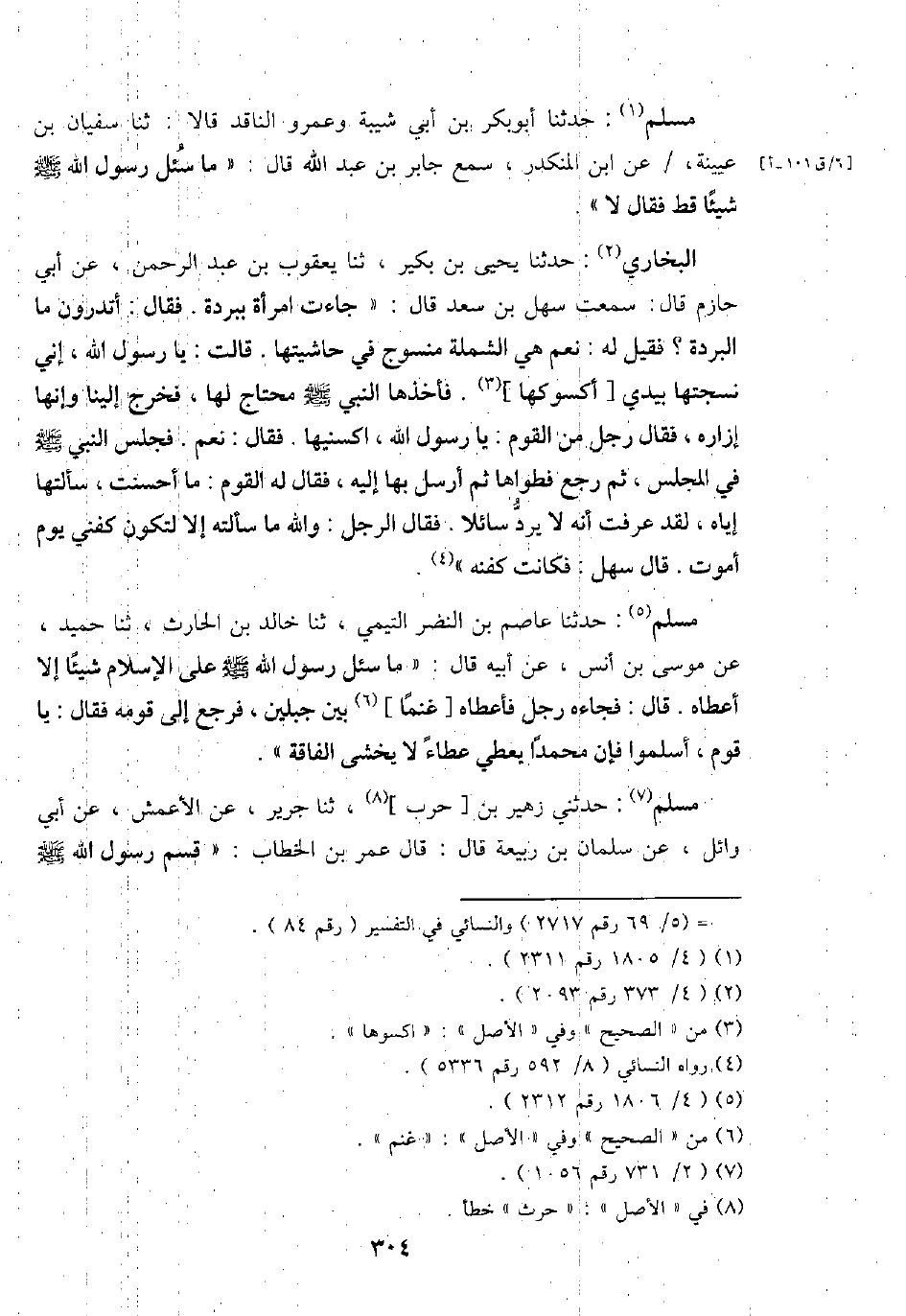 مُسلم: حَدثنَا أَبُو بكر بن أبي شيبَة وَعَمْرو النَّاقِد قَالَا: ثَنَا سُفْيَان بن عُيَيْنَة، / عَن ابْن الْمُنْكَدر، سمع جَابر بن عبد الله قَالَ: " مَا سُئِلَ رَسُول الله - صَلَّى اللَّهُ عَلَيْهِ وَسَلَّم َ - شَيْئا قطّ فَقَالَ لَا ".