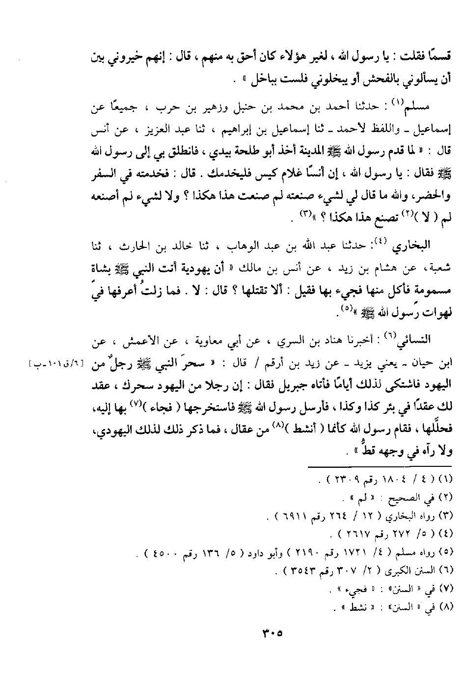 مُسلم: حَدثنَا أَحْمد بن مُحَمَّد بن حَنْبَل وَزُهَيْر بن حَرْب، جَمِيعًا عَن إِسْمَاعِيل - وَاللَّفْظ لِأَحْمَد - ثَنَا إِسْمَاعِيل بن إِبْرَاهِيم، ثَنَا عبد الْعَزِيز، عَن أنس قَالَ: " لما قدم رَسُول الله - صَلَّى اللَّهُ عَلَيْهِ وَسَلَّم َ - الْمَدِينَة أَخذ أَبُو طَلْحَة بيَدي، فَانْطَلق بِي إِلَى رَسُول الله - صَلَّى اللَّهُ عَلَيْهِ وَسَلَّم َ - فَقَالَ: يَا رَسُول الله، إِن أنسا غُلَام كيس فليخدمك، قَالَ: فخدمته فِي السّفر والحضر، وَالله مَا قَالَ لي لشي صَنعته هَذَا هَكَذَا؟ وَلَا لشَيْء لم أصنعه لم (لَا) تصنع هَذَا هَكَذَا؟ ".