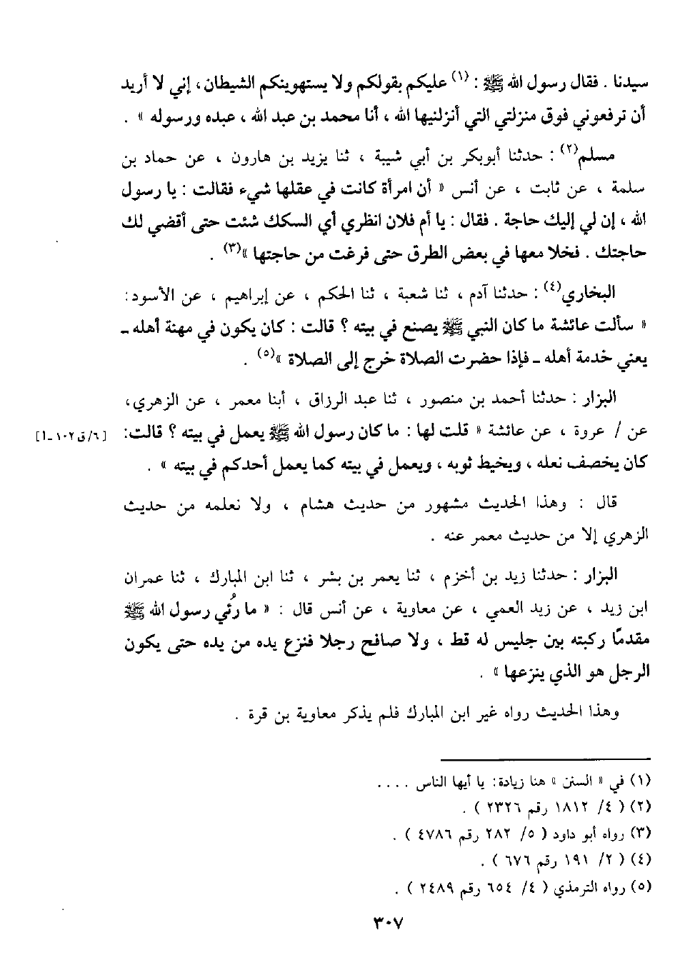 الْبَزَّار: حَدثنَا أَحْمد بن مَنْصُور، ثَنَا عبد الرَّزَّاق، أبنا معمر، عَن الزُّهْرِيّ، عَن / عُرْوَة، عَن عَائِشَة " قلت لَهَا: مَا كَانَ رَسُول الله - صَلَّى اللَّهُ عَلَيْهِ وَسَلَّم َ - يعْمل فِي بَيته؟ قَالَت: كَانَ يخصف نَعله، ويخيط ثَوْبه، وَيعْمل فِي بَيته كَمَا يعْمل أحدكُم فِي بَيته ".