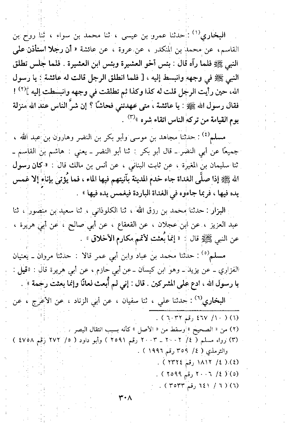 البُخَارِيّ: حَدثنَا عَمْرو بن عِيسَى، ثَنَا مُحَمَّد بن سَوَاء، ثَنَا روح بن الْقَاسِم، عَن مُحَمَّد بن الْمُنْكَدر، عَن عُرْوَة، عَن عَائِشَة " أَن رجلا اسْتَأْذن على النَّبِي - صَلَّى اللَّهُ عَلَيْهِ وَسَلَّم َ - فَلَمَّا رَآهُ قَالَ: بئس أَخُو الْعَشِيرَة وَبئسَ ابْن الْعَشِيرَة. فَلَمَّا جلس تطلق النَّبِي - صَلَّى اللَّهُ عَلَيْهِ وَسَلَّم َ - فِي وَجهه وانبسط إِلَيْهِ، [فَلَمَّا انْطلق الرجل قَالَت لَهُ عَائِشَة: يَا رَسُول الله، حِين رَأَيْت الرجل قلت لَهُ كَذَا وَكَذَا ثمَّ تطلقت فِي وَجهه وانبسطت إِلَيْهِ] ! فَقَالَ رَسُول الله - صَلَّى اللَّهُ عَلَيْهِ وَسَلَّم َ -: يَا عَائِشَة، مَتى عهدتني فحاشا؟ إِن شَرّ النَّاس عِنْد الله منزلَة يَوْم الْقِيَامَة من تَركه النَّاس اتقاء شَره ".