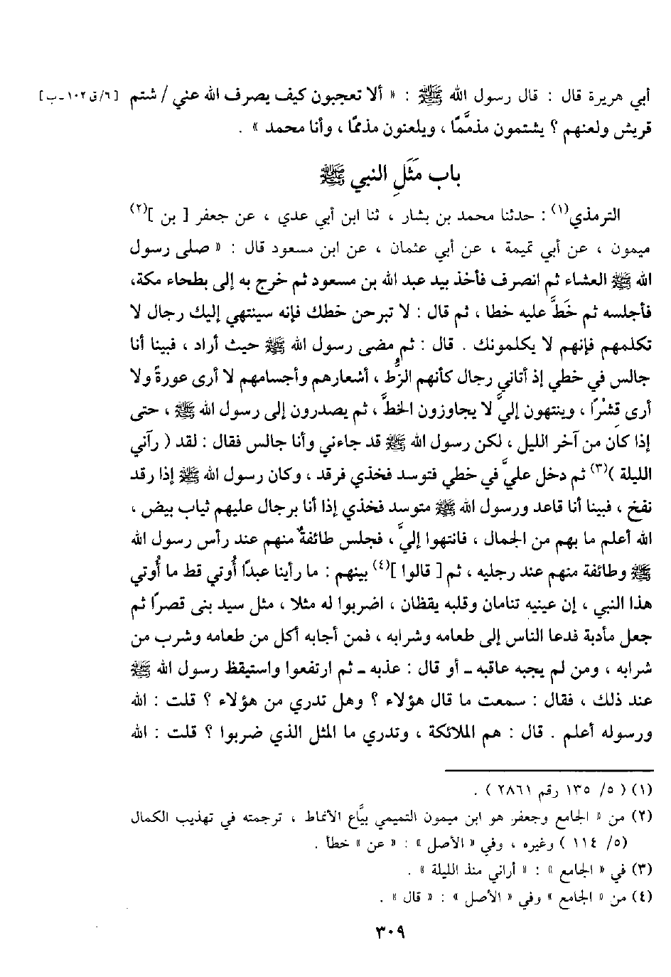 التِّرْمِذِيّ: حَدثنَا مُحَمَّد بن بشار، ثَنَا ابْن أبي عدي، عَن جَعْفَر [بن] مَيْمُون، عَن أبي تَمِيمَة، عَن أبي عُثْمَان، عَن ابْن مَسْعُود قَالَ: " صلى رَسُول الله - صَلَّى اللَّهُ عَلَيْهِ وَسَلَّم َ - الْعشَاء ثمَّ انْصَرف فَأخذ بيد عبد الله بن مَسْعُود ثمَّ خرج بِهِ إِلَى بطحاء مَكَّة، فأجلسه ثمَّ خطّ عَلَيْهِ خطا، ثمَّ قَالَ: لَا تبرحن خطك فَإِنَّهُ سينتهي إِلَيْك رجال لَا تكلمهم فَإِنَّهُم لَا يكلمونك. قَالَ: ثمَّ مضى رَسُول الله - صَلَّى اللَّهُ عَلَيْهِ وَسَلَّم َ - حَيْثُ أَرَادَ، فَبينا أَنا جَالس فِي خطي إِذْ أَتَانِي رجال كَأَنَّهُمْ الزط، أشعارهم وأجسامهم لَا أرى عَورَة وَلَا أرى قشرا، وينتهون إِلَيّ لَا يجاوزون الْخط، ثمَّ يصدرون إِلَى رَسُول الله - صَلَّى اللَّهُ عَلَيْهِ وَسَلَّم َ -، حَتَّى إِذا كَانَ من آخر اللَّيْل، لَكِن رَسُول الله - صَلَّى اللَّهُ عَلَيْهِ وَسَلَّم َ - قد جَاءَنِي وَأَنا جَالس فَقَالَ: لقد (رَآنِي اللَّيْلَة) ثمَّ دخل عَليّ فِي خطي فتوسد فَخذي فرقد، وَكَانَ رَسُول الله - صَلَّى اللَّهُ عَلَيْهِ وَسَلَّم َ - إِذا رقد نفخ، فَبينا أَن قَاعد وَرَسُول الله - صَلَّى اللَّهُ عَلَيْهِ وَسَلَّم َ - مُتَوَسِّد فَخذي إِذا أَنا بِرِجَال عَلَيْهِم ثِيَاب بيض، الله أعلم مَا بهم من الْجمال، فَانْتَهوا إِلَيّ، فَجَلَسَ طَائِفَة مِنْهُم عِنْد رَأس رَسُول الله - صَلَّى اللَّهُ عَلَيْهِ وَسَلَّم َ - وَطَائِفَة مِنْهُم عِنْد رجلَيْهِ، ثمَّ [قَالُوا] بَينهم: مَا رَأينَا عبدا أُوتِيَ قطّ مَا أُوتِيَ هَذَا النَّبِي، إِن عَيْنَيْهِ تنامان وَقَلبه يقظان، اضربوا لَهُ مثلا، مثل سيد بنى قصرا ثمَّ جعل مأدبة فَدَعَا النَّاس إِلَى طَعَامه وَشَرَابه، فَمن أَجَابَهُ أكل من طَعَامه وَشرب من شرابه، وَمن لم يجبهُ عاقبه - أَو قَالَ: عذبه - ثمَّ ارتفعوا واستيقظ رَسُول الله - صَلَّى اللَّهُ عَلَيْهِ وَسَلَّم َ - عِنْد ذَلِك، فَقَالَ: سَمِعت مَا قَالَ هَؤُلَاءِ؟ وَهل تَدْرِي من هَؤُلَاءِ؟ قلت: الله وَرَسُوله أعلم. قَالَ: هم الْمَلَائِكَة، وَتَدْرِي مَا الْمثل الَّذِي ضربوا؟ قلت: الله