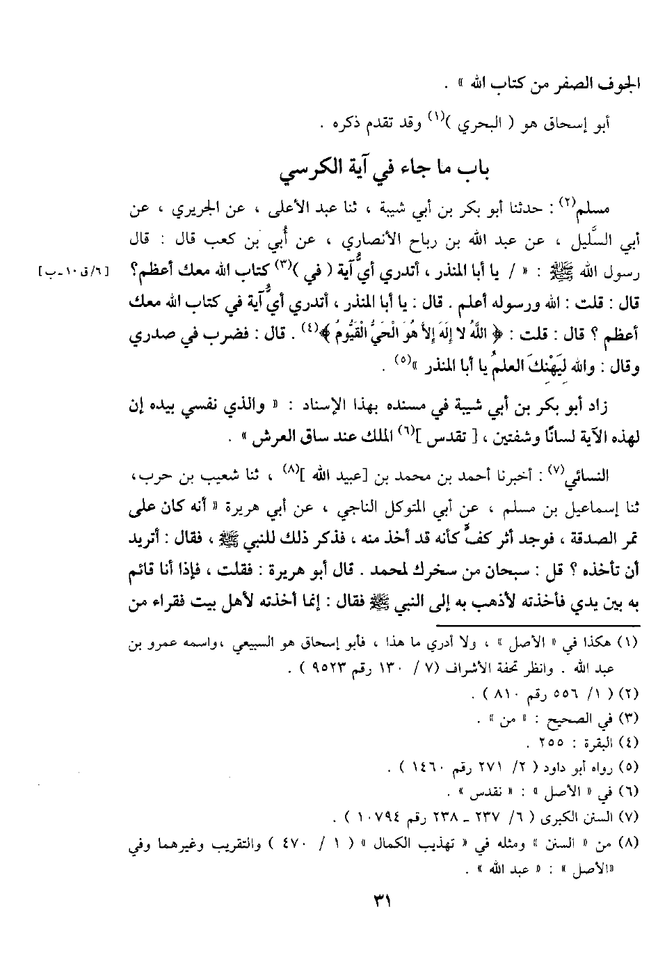 مُسلم: حَدثنَا أَبُو بكر بن أبي شيبَة، ثَنَا عبد الْأَعْلَى، عَن الْجريرِي، عَن أبي السَّلِيل، عَن عبد الله بن رَبَاح الْأنْصَارِيّ، عَن أبي بن كَعْب قَالَ: قَالَ رَسُول الله - صَلَّى اللَّهُ عَلَيْهِ وَسَلَّم َ -: " / يَا أَبَا الْمُنْذر، أَتَدْرِي أَي آيَة (فِي) كتاب الله مَعَك أعظم؟ قَالَ: قلت: الله وَرَسُوله أعلم. قَالَ: يَا أَبَا الْمُنْذر، أَتَدْرِي أَي آيَة فِي كتاب الله مَعَك أعظم؟ قَالَ: قلت: {الله لَا إِلَه إِلَّا هُوَ الْحَيّ القيوم} . قَالَ: فَضرب فِي صَدْرِي وَقَالَ: وَالله لِيَهنك الْعلم يَا أَبَا الْمُنْذر ".