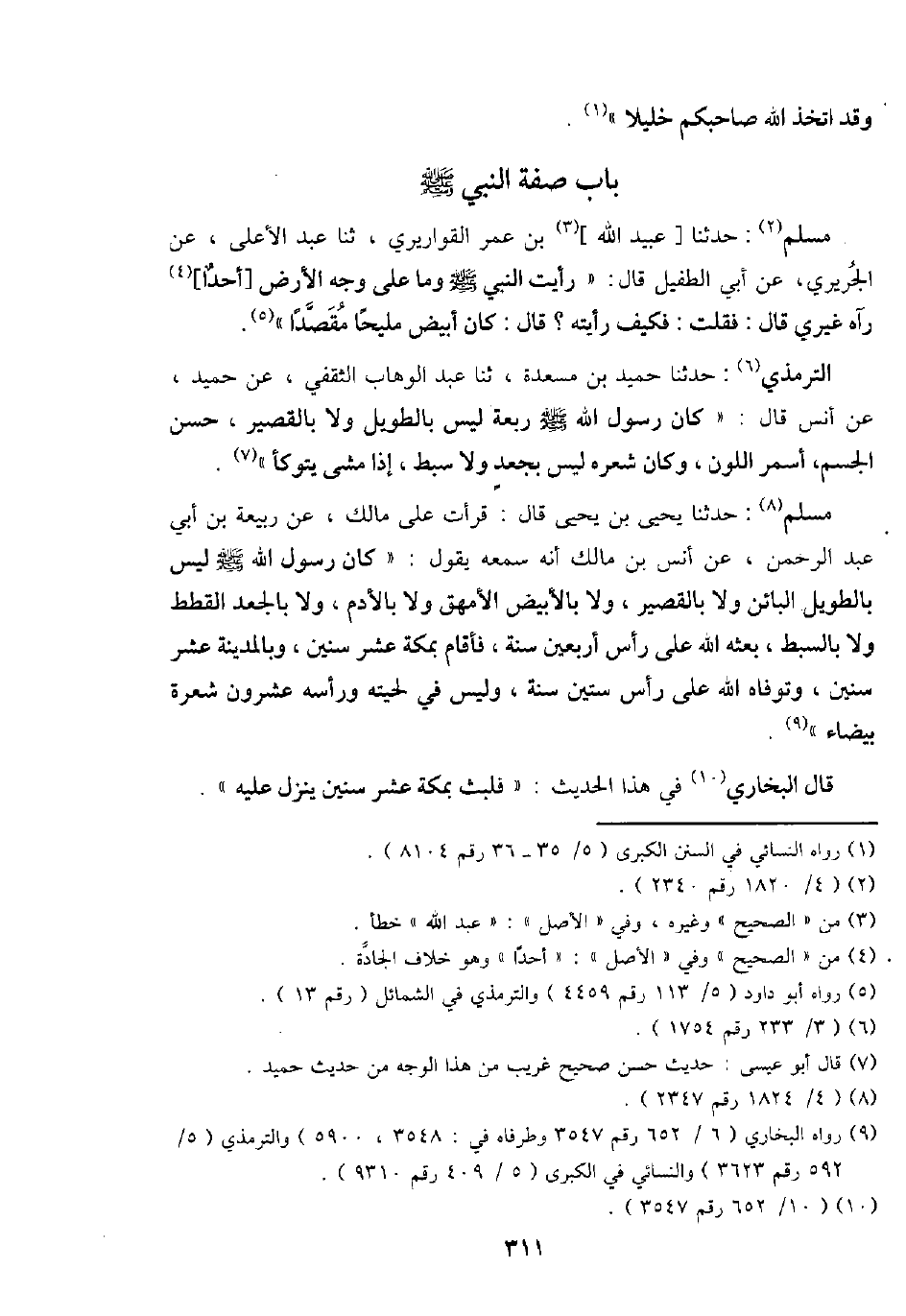 مُسلم: حَدثنَا يحيى بن يحيى قَالَ: قَرَأت على مَالك، عَن ربيعَة بن أبي عبد الرَّحْمَن، عَن أنس بن مَالك أَنه سَمعه يَقُول: " كَانَ رَسُول الله - صَلَّى اللَّهُ عَلَيْهِ وَسَلَّم َ - لَيْسَ بالطويل الْبَائِن وَلَا بالقصير، وَلَا بالأبيض الأمهق وَلَا بِالْأدمِ، وَلَا بالجعد القطط وَلَا بالسبط، بَعثه الله على رَأس أَرْبَعِينَ سنة، فَأَقَامَ بِمَكَّة عشر سِنِين، وبالمدينة عشر سِنِين، وتوفاه الله على رَأس سِتِّينَ سنة، وَلَيْسَ فِي لحيته وَرَأسه عشرُون شَعْرَة بَيْضَاء ".