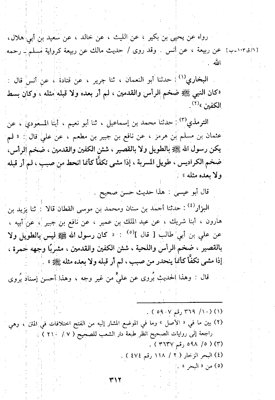 التِّرْمِذِيّ: حَدثنَا مُحَمَّد بن إِسْمَاعِيل، ثَنَا أَبُو نعيم، أبنا المَسْعُودِيّ، عَن عُثْمَان بن مُسلم بن هُرْمُز، عَن نَافِع بن جُبَير بن مطعم، عَن عَليّ قَالَ: " لم يكن رَسُول الله - صَلَّى اللَّهُ عَلَيْهِ وَسَلَّم َ - بالطويل وَلَا بالقصير، شثن الْكَفَّيْنِ والقدمين، ضخم الرَّأْس، ضخم الكراديس، طَوِيل المسربة، إِذا مَشى تكفأ كَأَنَّمَا انحط من صبب، لم أر قبله وَلَا بعده مثله ".