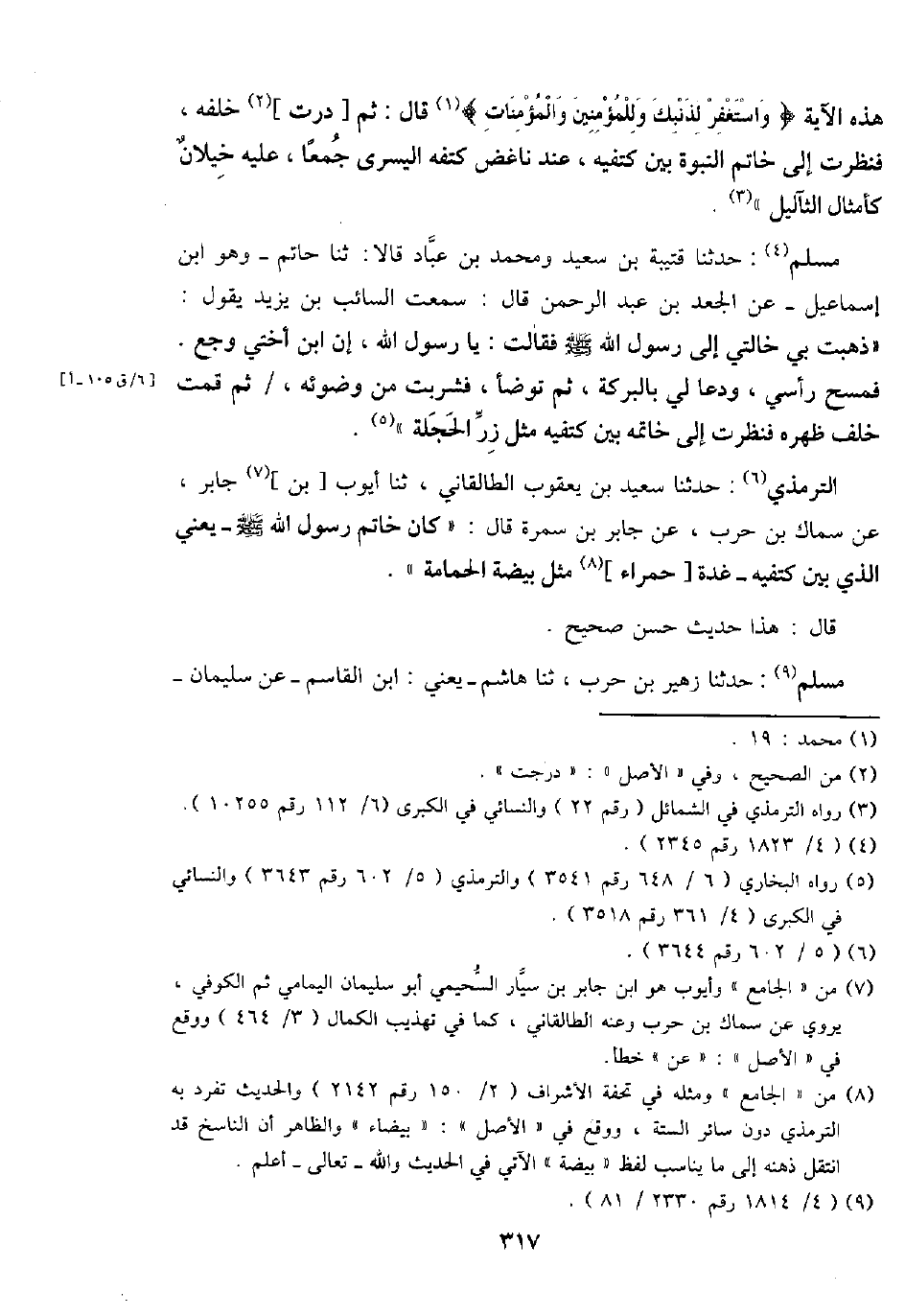 مُسلم: حَدثنَا قُتَيْبَة بن سعيد وَمُحَمّد بن عباد قَالَا: ثَنَا حَاتِم - وَهُوَ ابْن إِسْمَاعِيل - عَن الْجَعْد بن عبد الرَّحْمَن قَالَ: سَمِعت السَّائِب بن يزِيد يَقُول: " ذهبت بِي خَالَتِي إِلَى رَسُول الله - صَلَّى اللَّهُ عَلَيْهِ وَسَلَّم َ - فَقَالَت: يَا رَسُول الله، إِن ابْن أُخْتِي وجع. فَمسح رَأْسِي، ودعا لي بِالْبركَةِ، ثمَّ تَوَضَّأ، فَشَرِبت من وضوئِهِ، / ثمَّ قُمْت خلف ظَهره فَنَظَرت إِلَى خَاتمه بَين كَتفيهِ مثل زر الحجلة ".