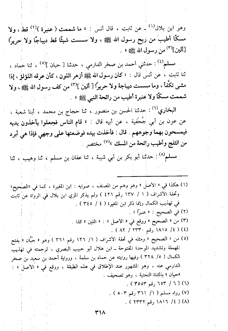 مُسلم: حَدثنِي أَحْمد بن صَخْر الدَّارمِيّ، حَدثنَا [حبَان] ، ثَنَا حَمَّاد، ثَنَا ثَابت، عَن أنس قَالَ: " كَانَ رَسُول الله - صَلَّى اللَّهُ عَلَيْهِ وَسَلَّم َ - أَزْهَر اللَّوْن، كَأَن عرقه اللُّؤْلُؤ، إِذا مَشى تكفأ، وَمَا مسست ديباجة وَلَا حَرِيرًا [أَلين] من كف رَسُول الله - صَلَّى اللَّهُ عَلَيْهِ وَسَلَّم َ -، وَلَا شممت مسكا وَلَا عنبرة أطيب من رَائِحَة النَّبِي - صَلَّى اللَّهُ عَلَيْهِ وَسَلَّم َ - ".